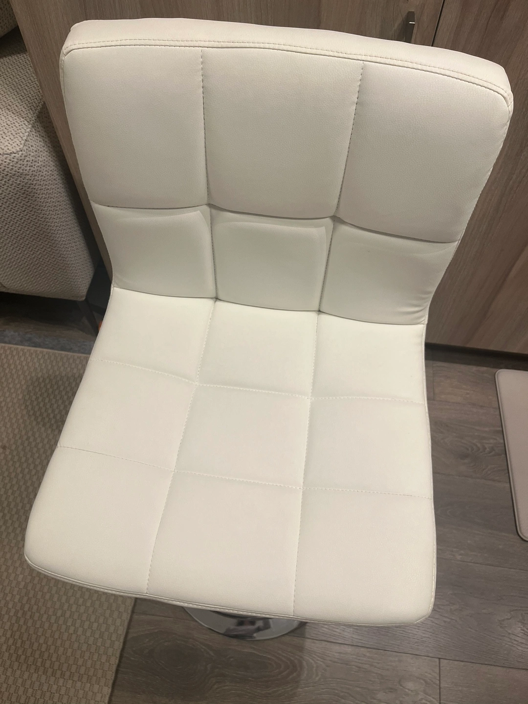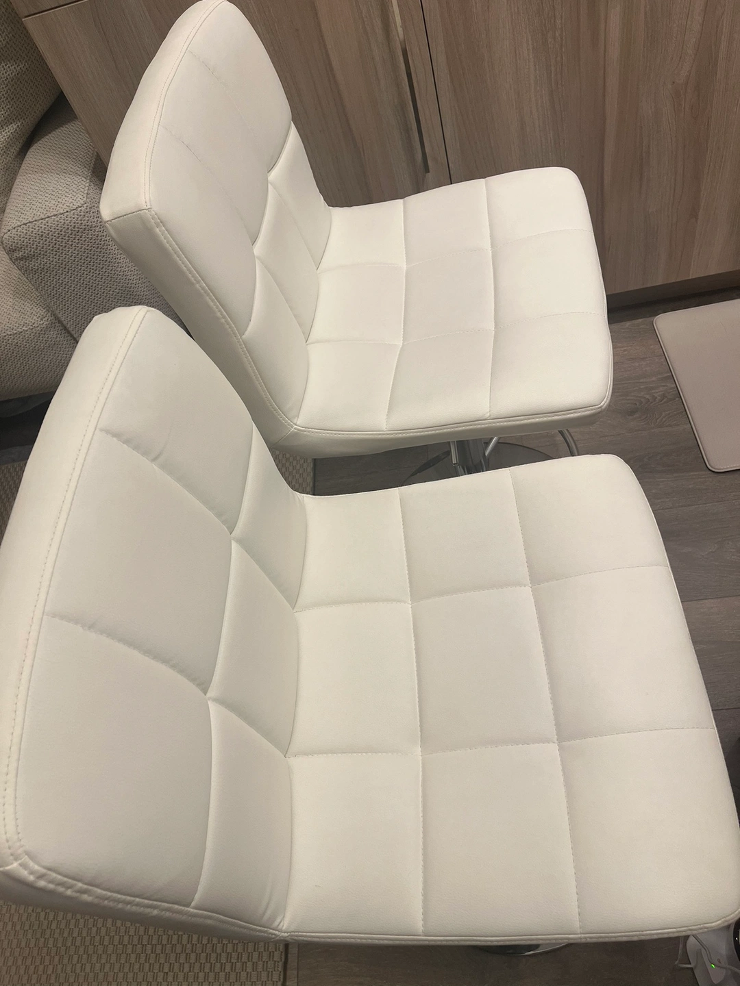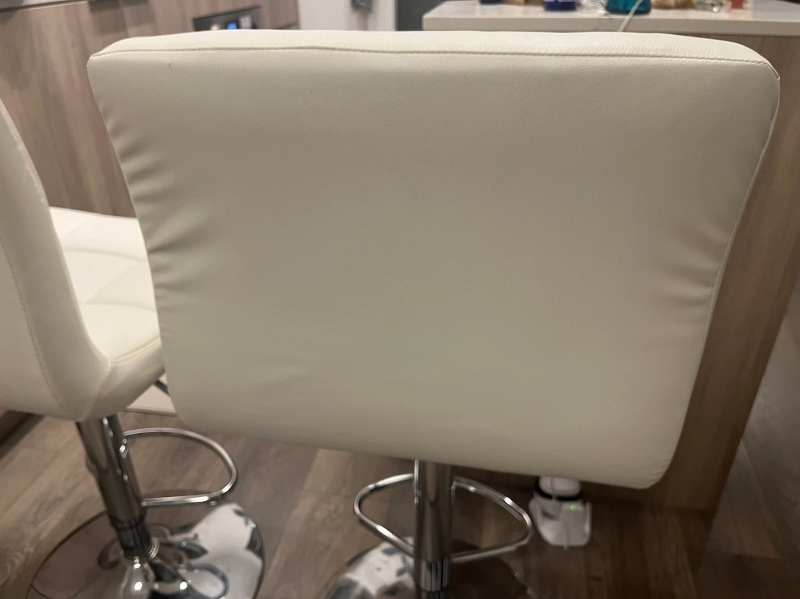 Set of 2 white bar stools with chrome base. Adjustable height. Good condition.