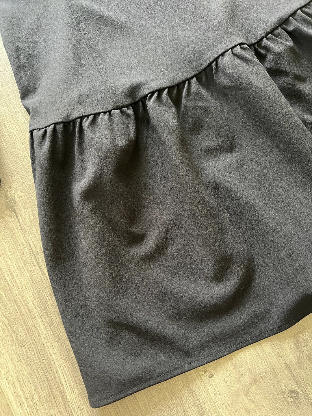 170Black dress with sleeves and a ruffle at the bottom. Zipper closure at the back.