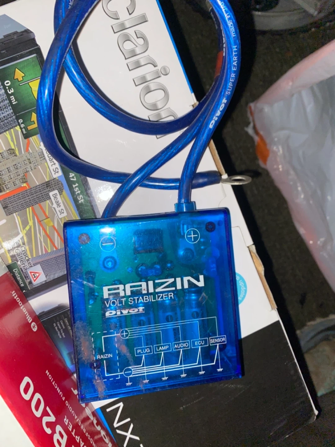 This is a RAIZIN Volt Stabilizer by PIVOT. It's designed for Plug, Lamp, Audio, ECU, and Sensor connections.
