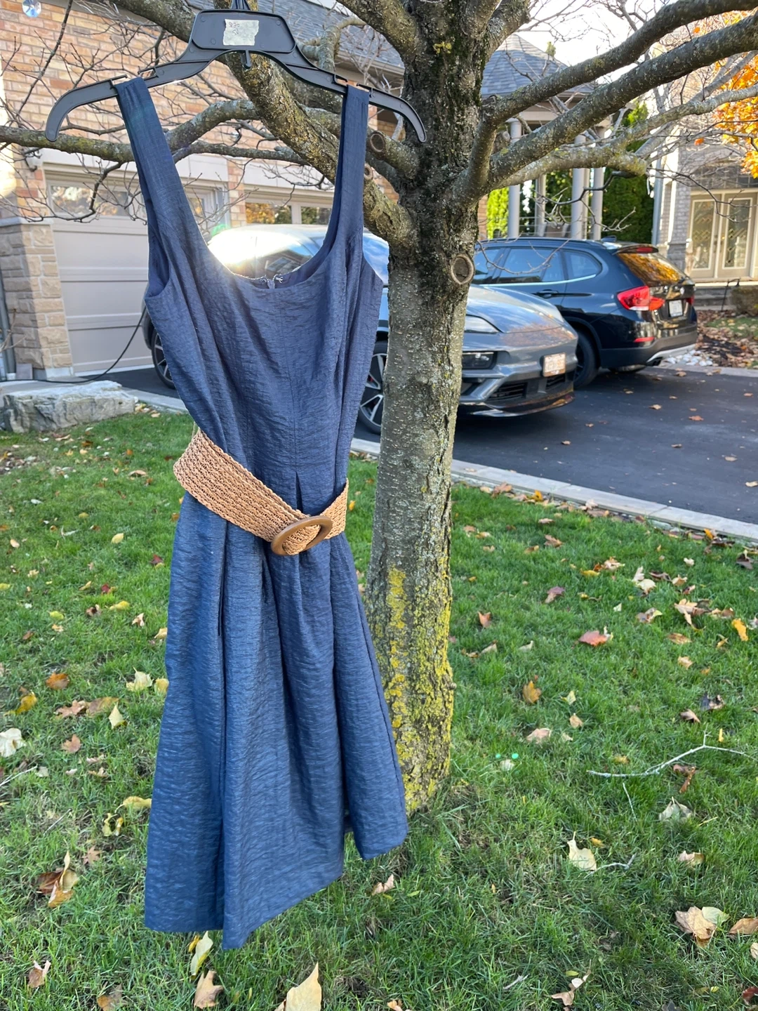 Selling a Nine West dress in navy blue! It's in great condition and would be a lovely addition to your wardrobe. The dress has a woven belt detail that adds a nice touch.
