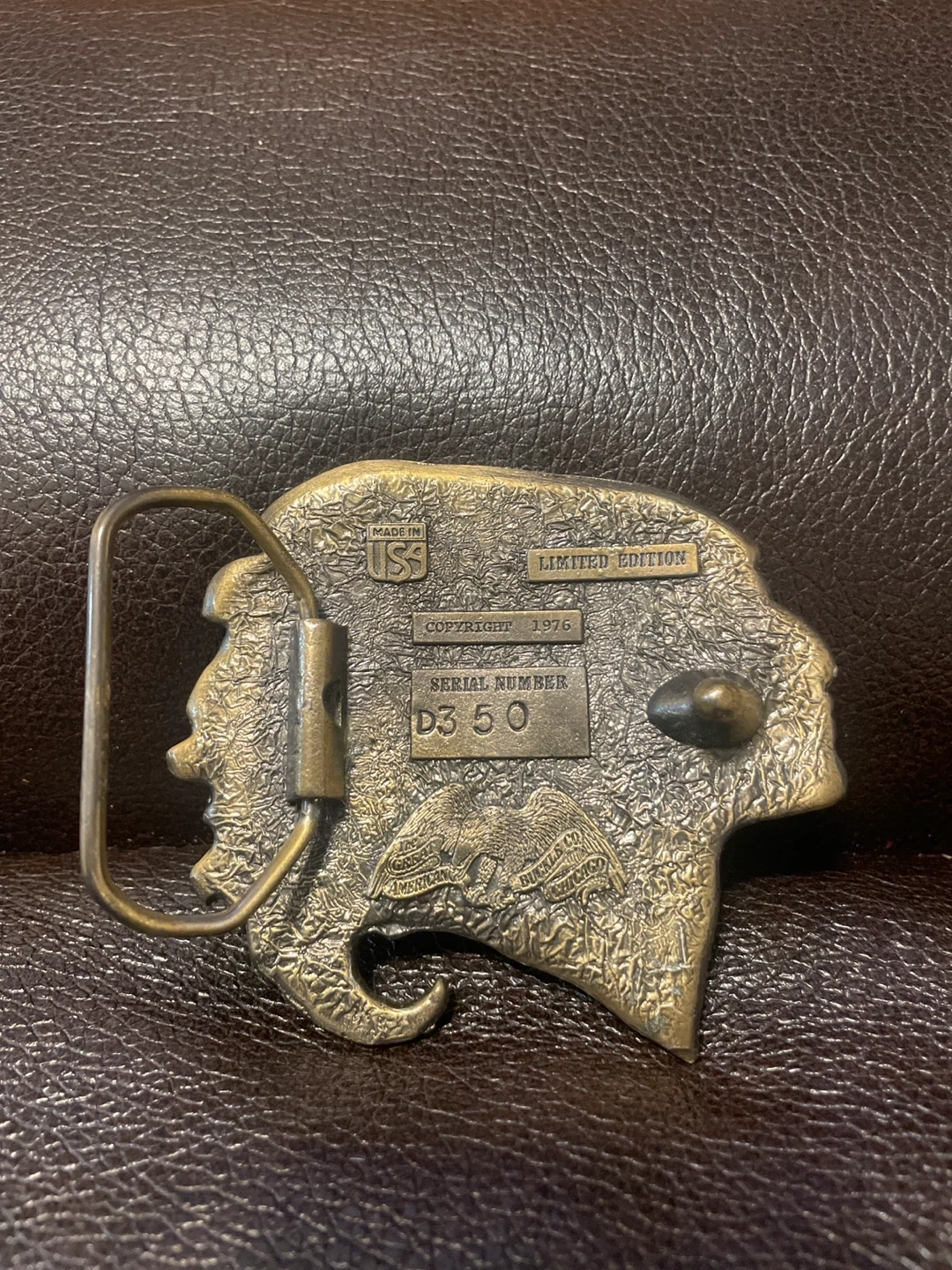 This is a limited edition belt buckle featuring an Indian Chief design. Copyrighted in 1976, it's a collectible piece. The buckle is made of metal with painted accents. Serial number D350 is visible.