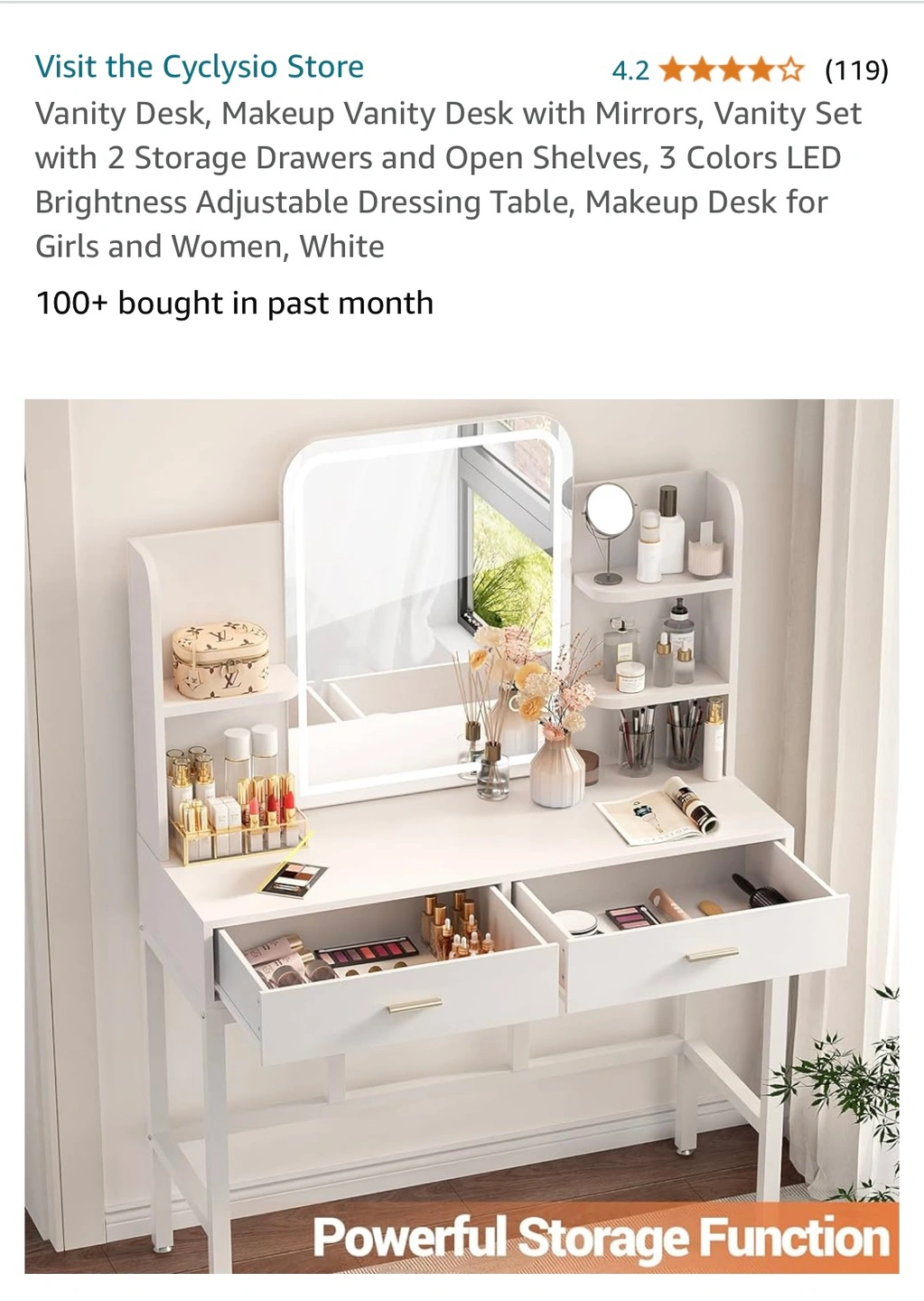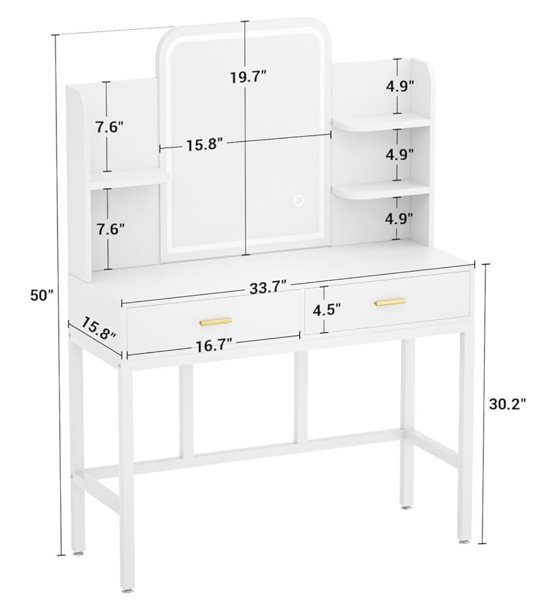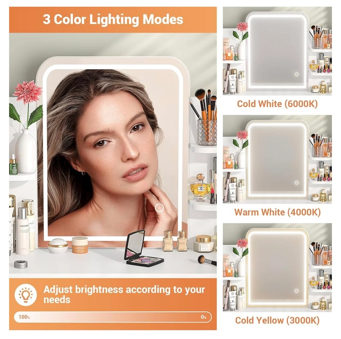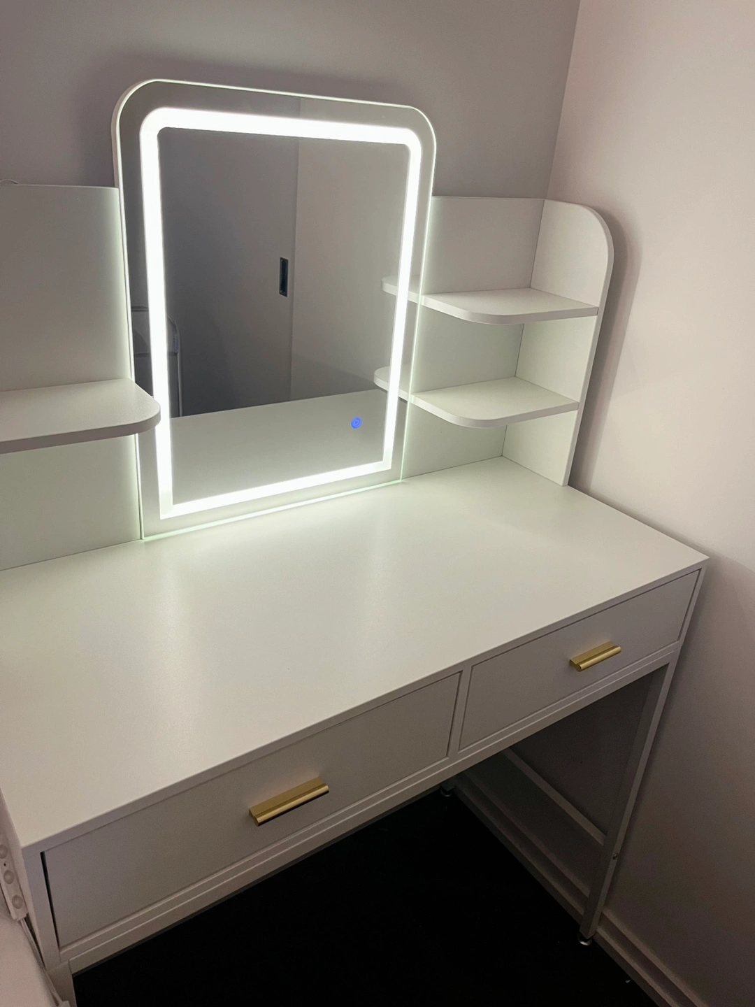 Vanity desk with a lighted mirror, two drawers, and shelves. Three light settings and adjustable brightness.