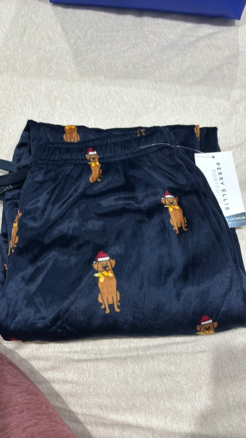 89Navy blue pajama pants with a Christmas dog pattern. Elastic waistband with drawstring.