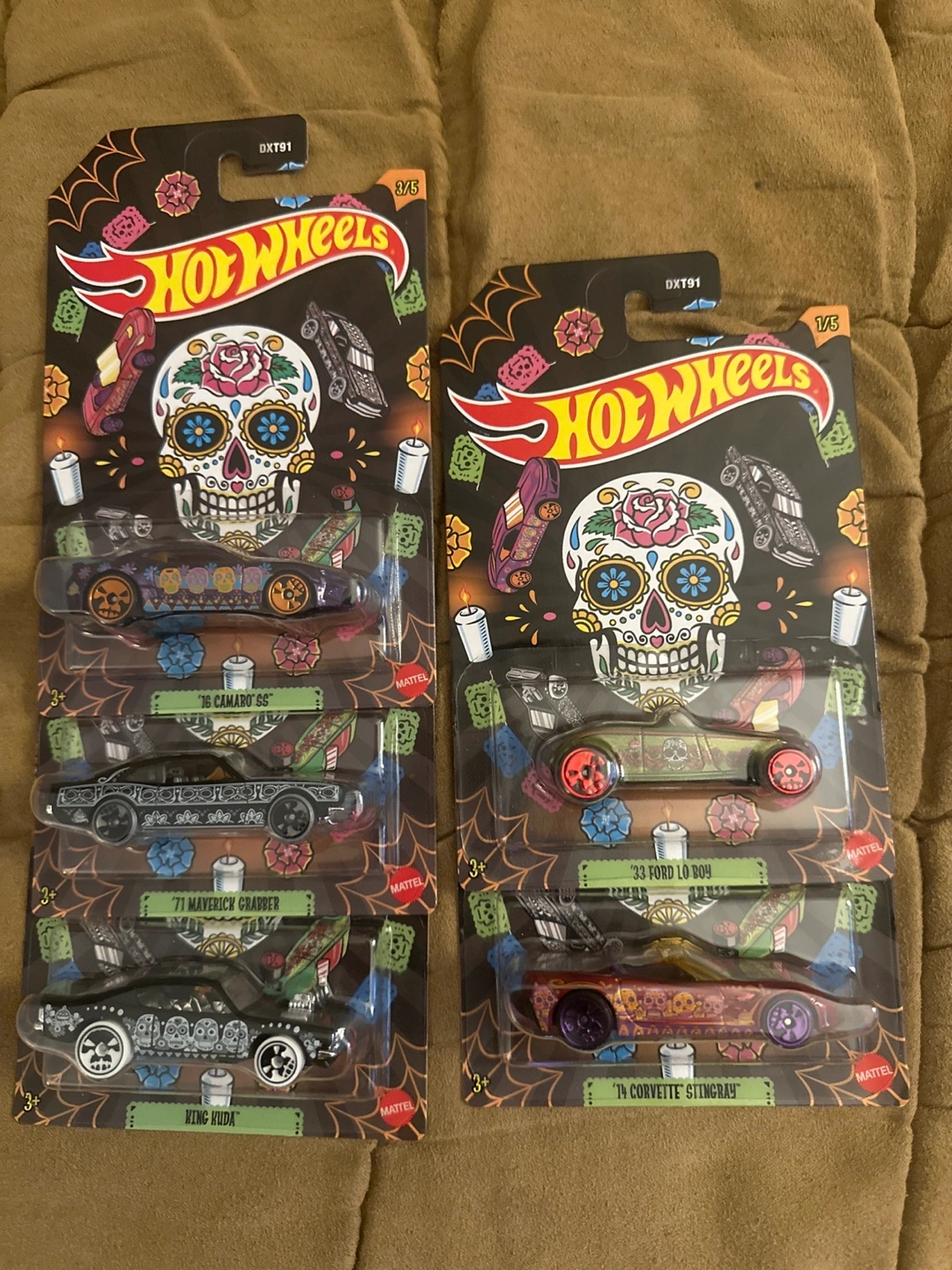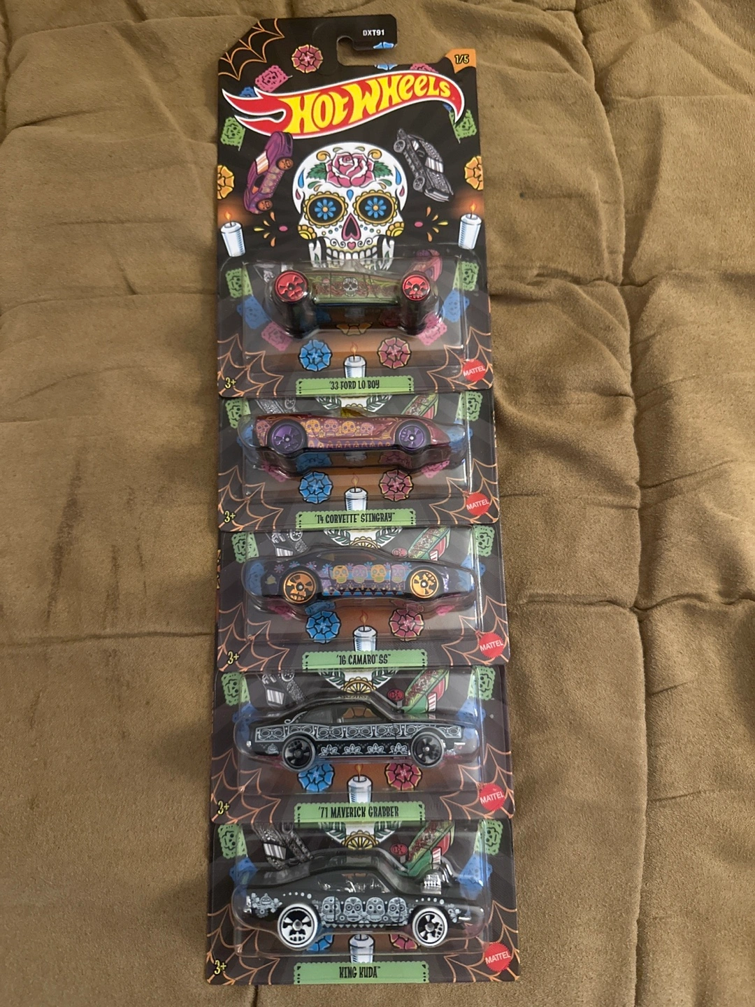 Five car set featuring a '71 Maverick Grabber, '68 Camaro SS, '76 Corvette Stingray, '63 Ford Lo-Boy, and King Kuda. get this set for your collection today.
