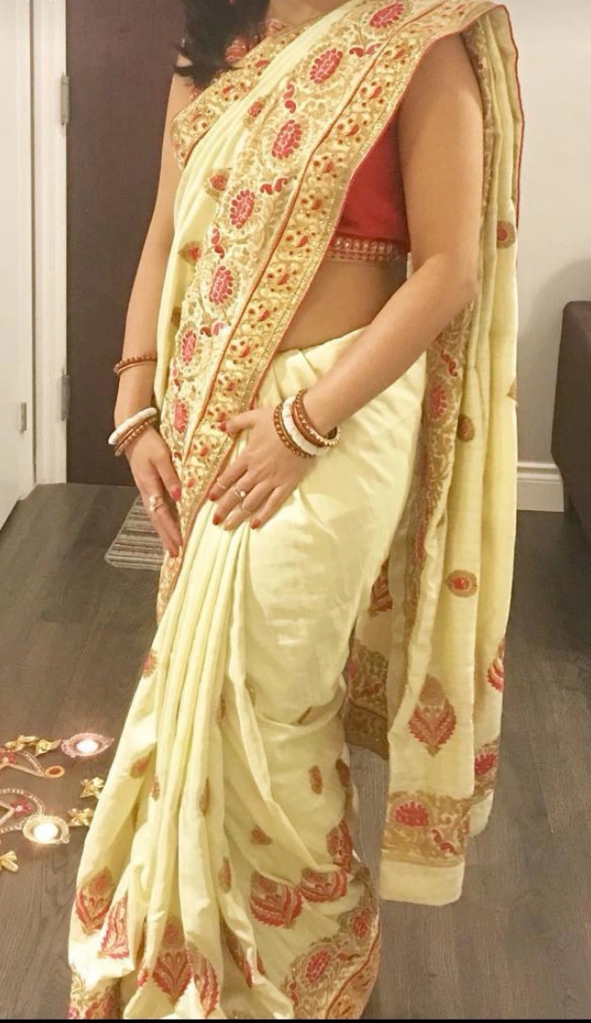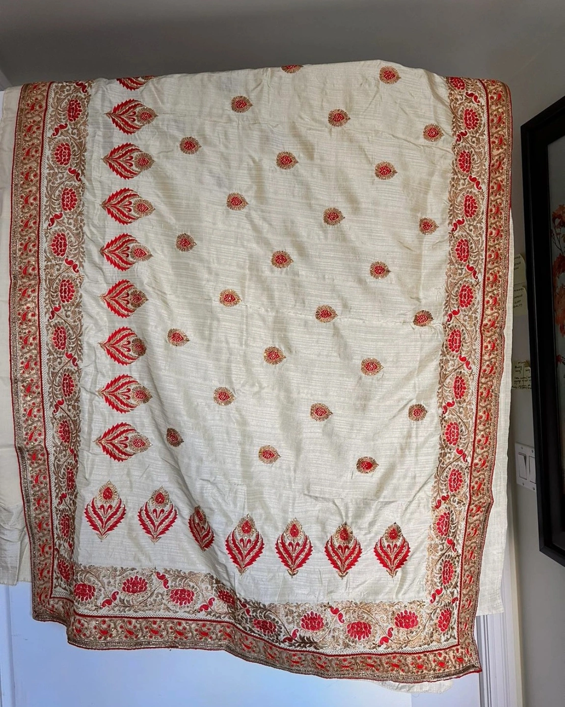 Beautiful Indian saree in tasar silk, ivory, gold and red combination embroidery. 😍