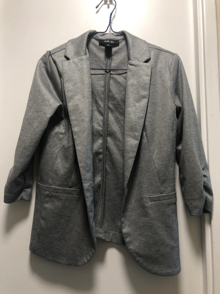 Grey blazer with long sleeves and a front button closure. Looks dark grey in pic but it’s actually light silver and catches the light aka sparkly.