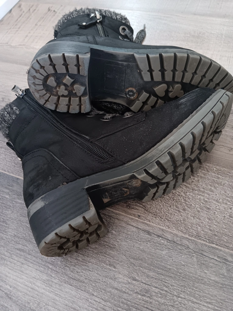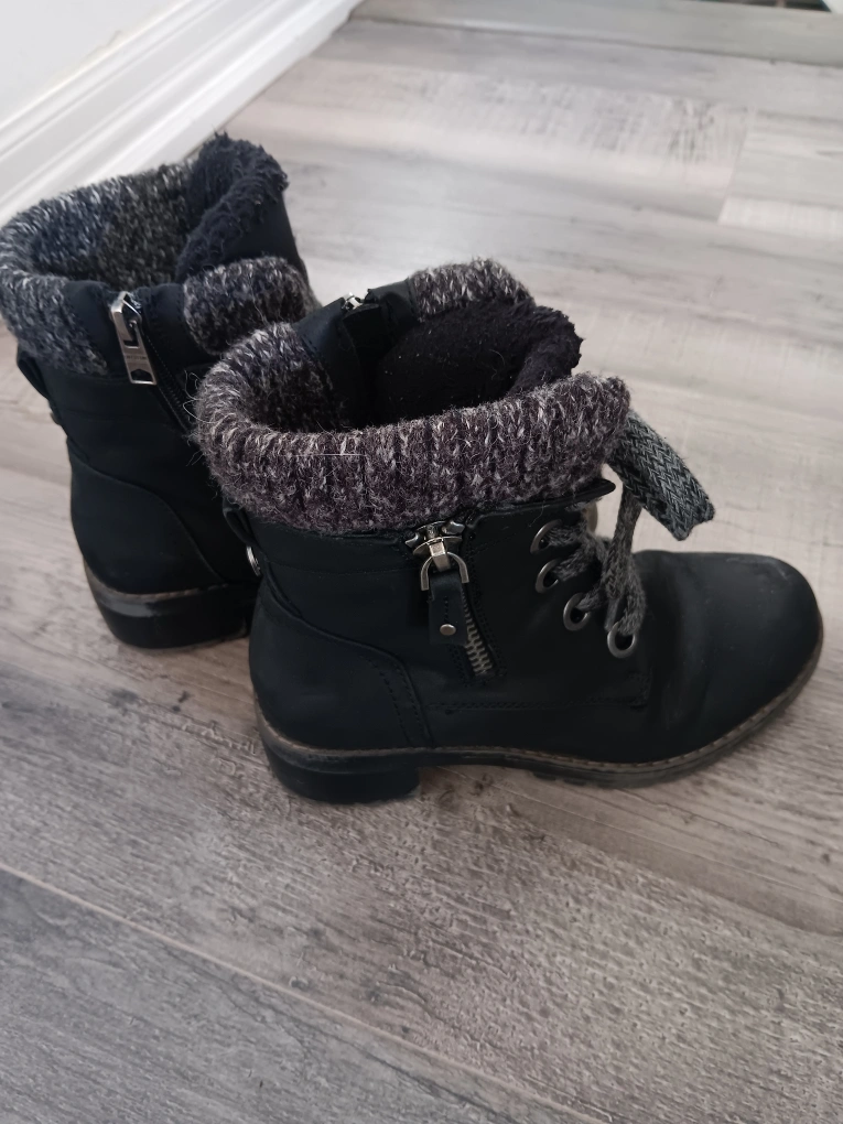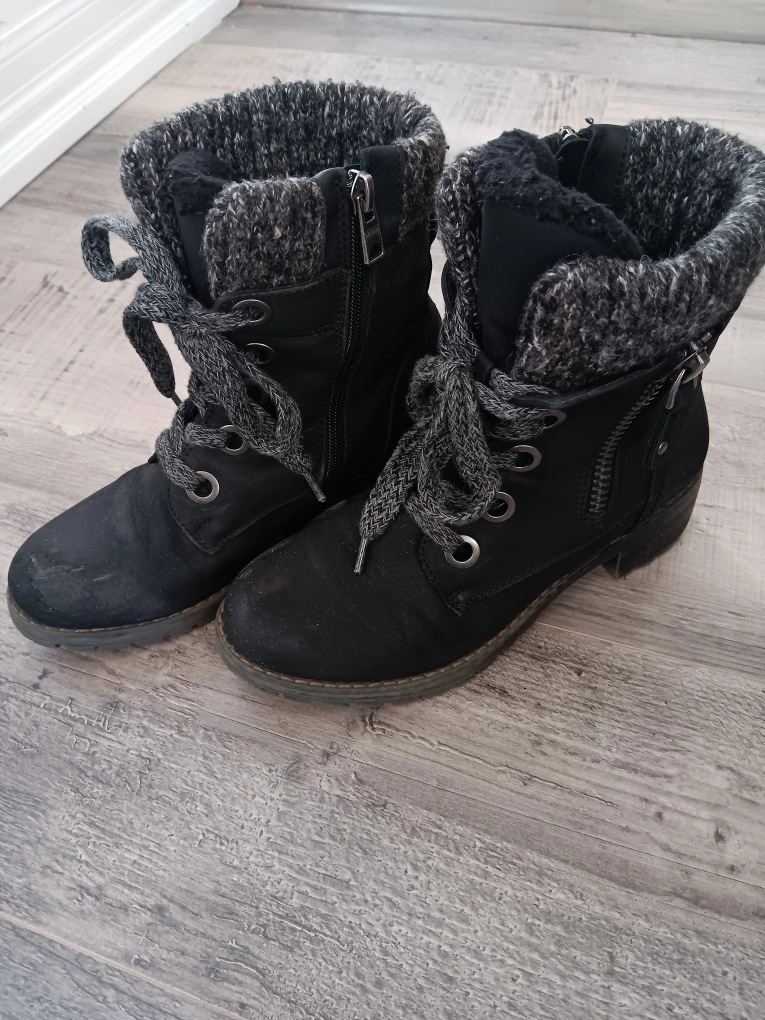 Black ankle boots with lace-up detail and side zipper. Knit cuff, fleece lined. Some scuffing on the toe.