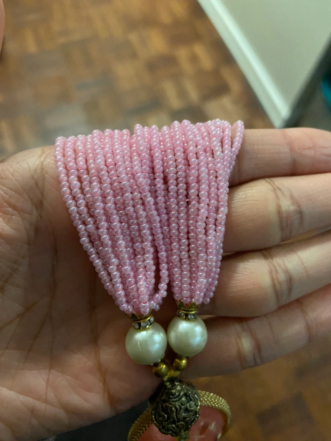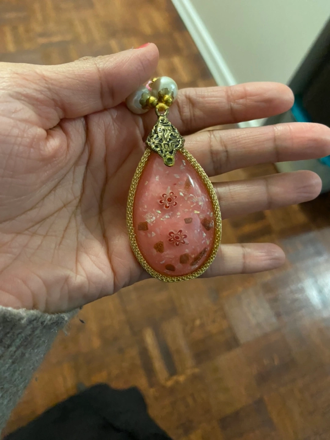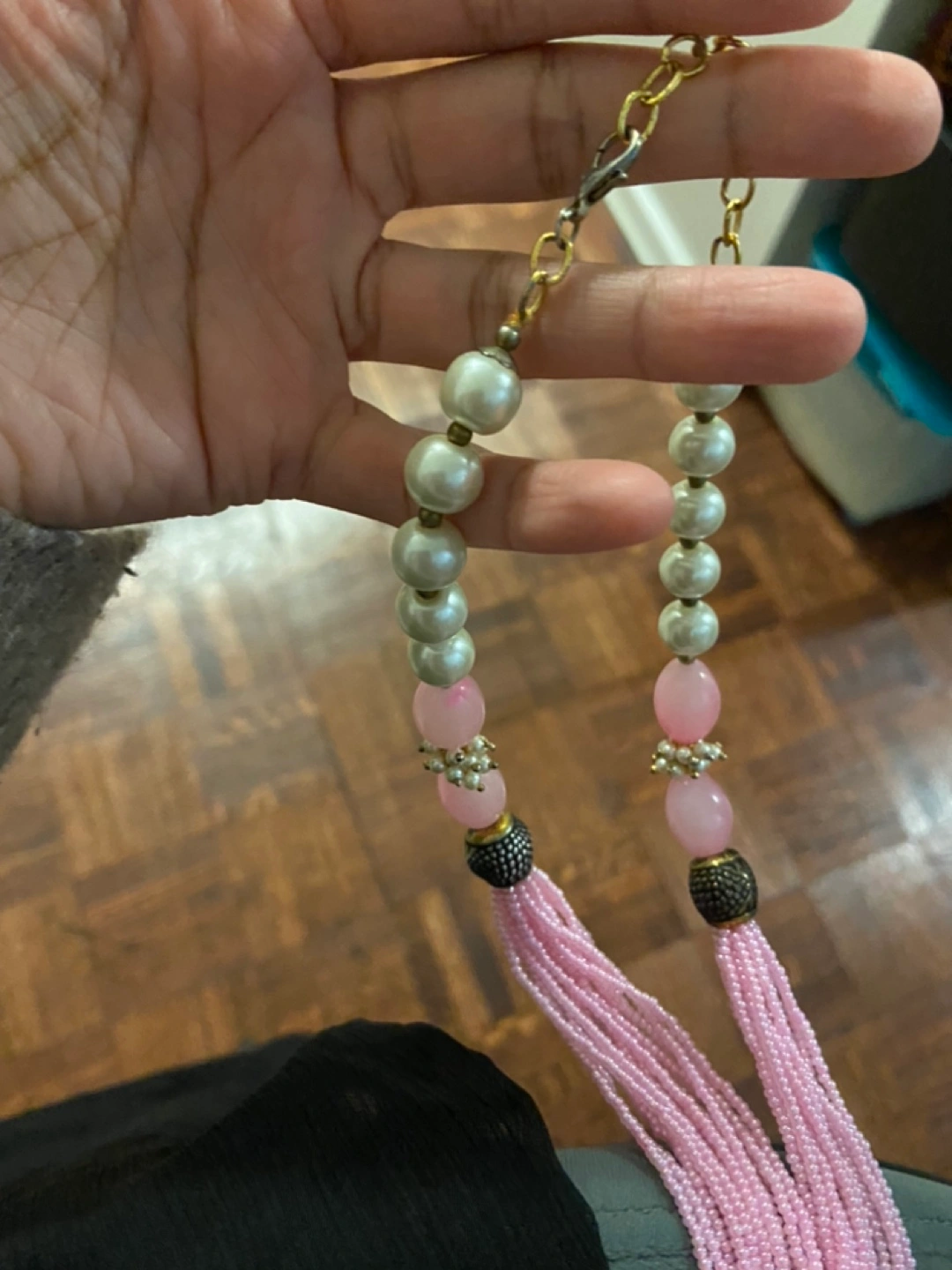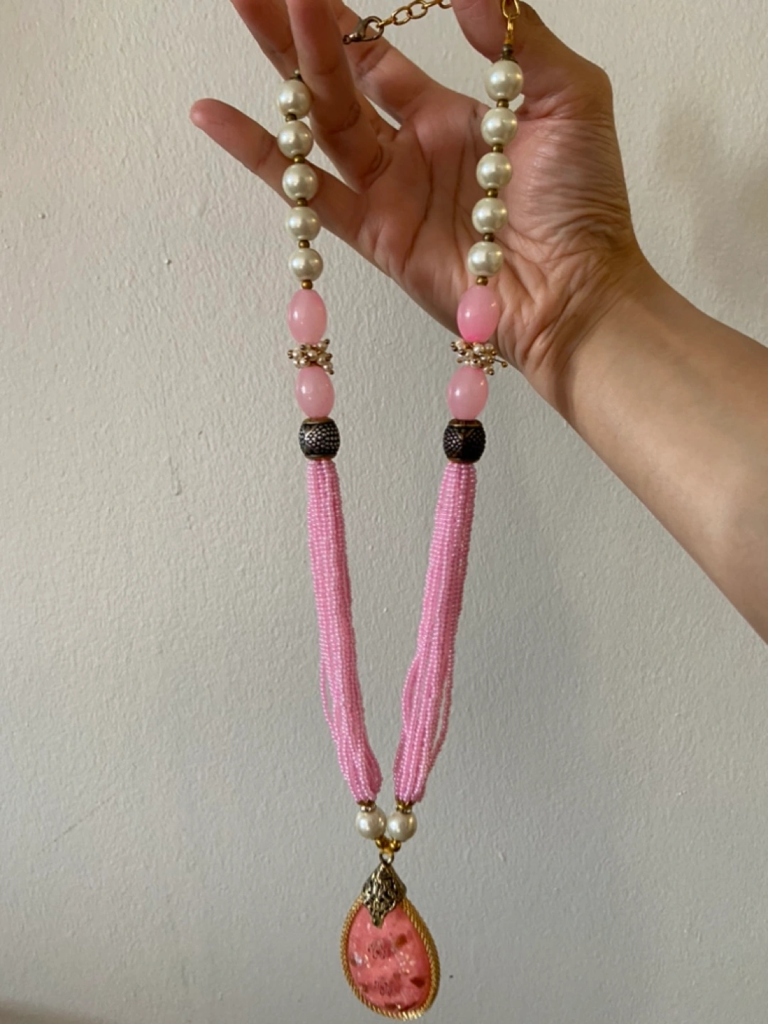 Pink beaded necklace with a large pink pendant and white pearls.