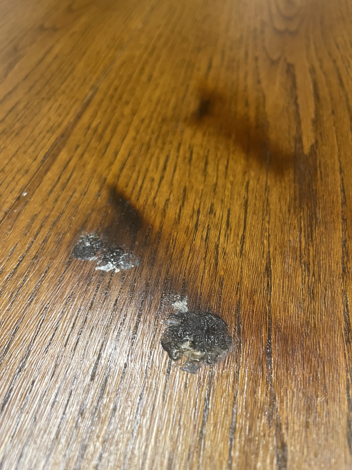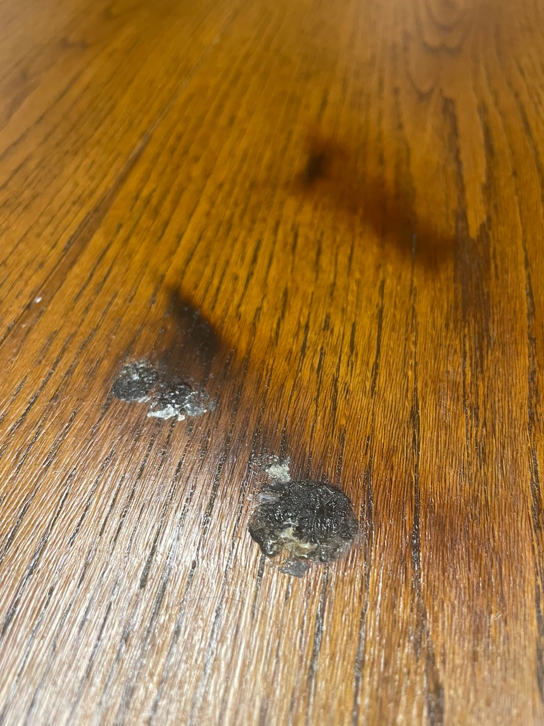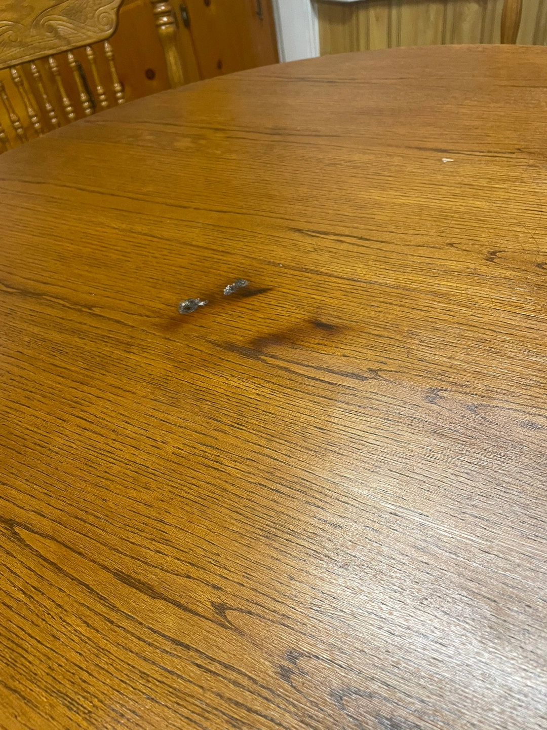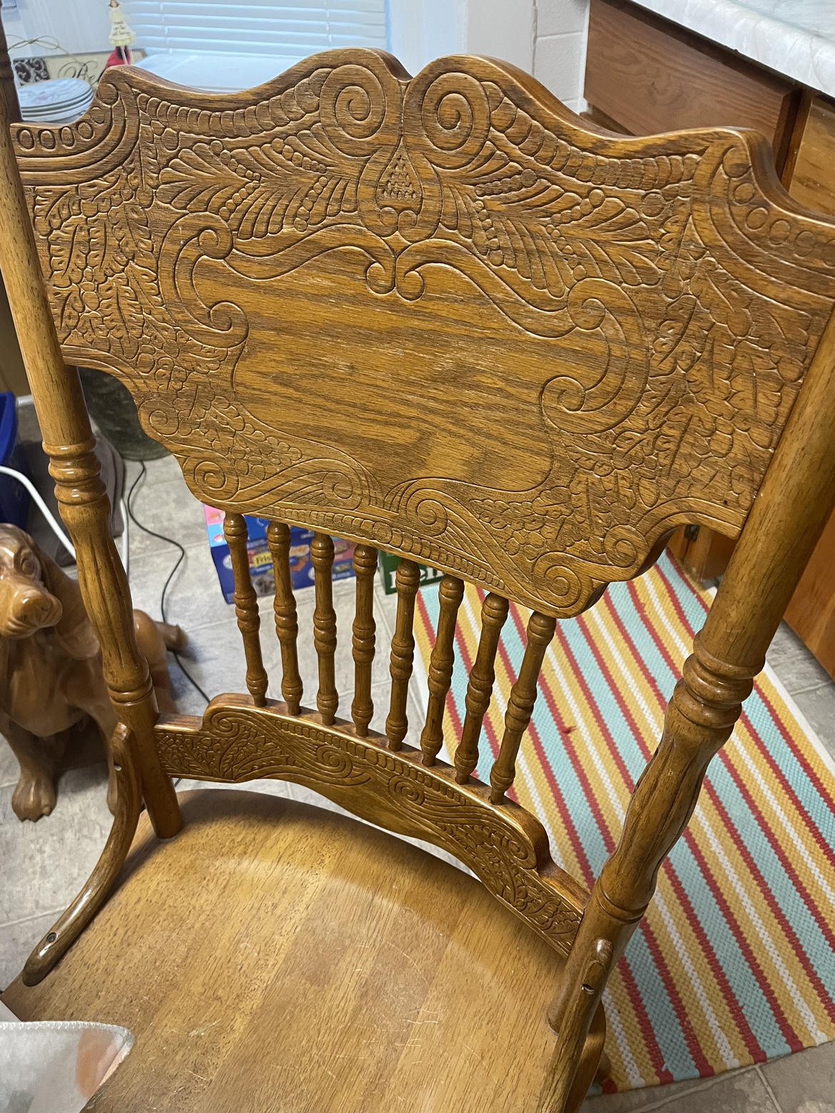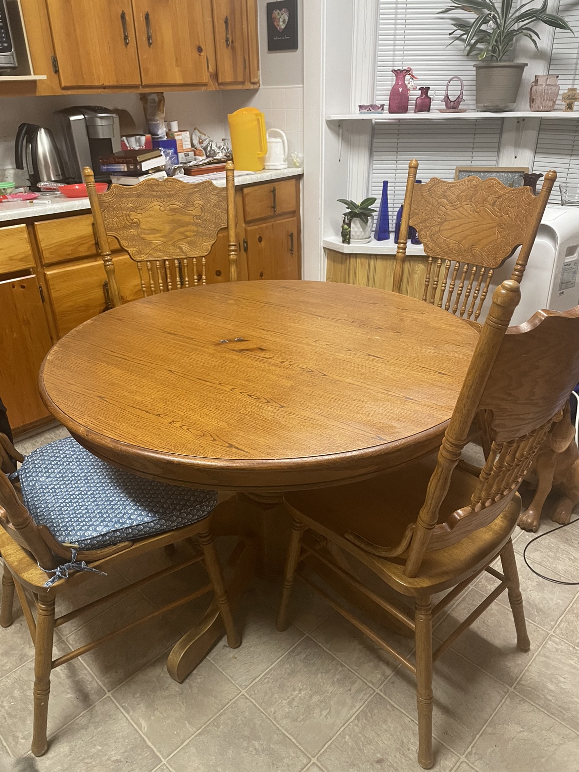 Round table with four chairs. Table has some minor blemishes. Chairs have carved backs. Moving must sell, $75.