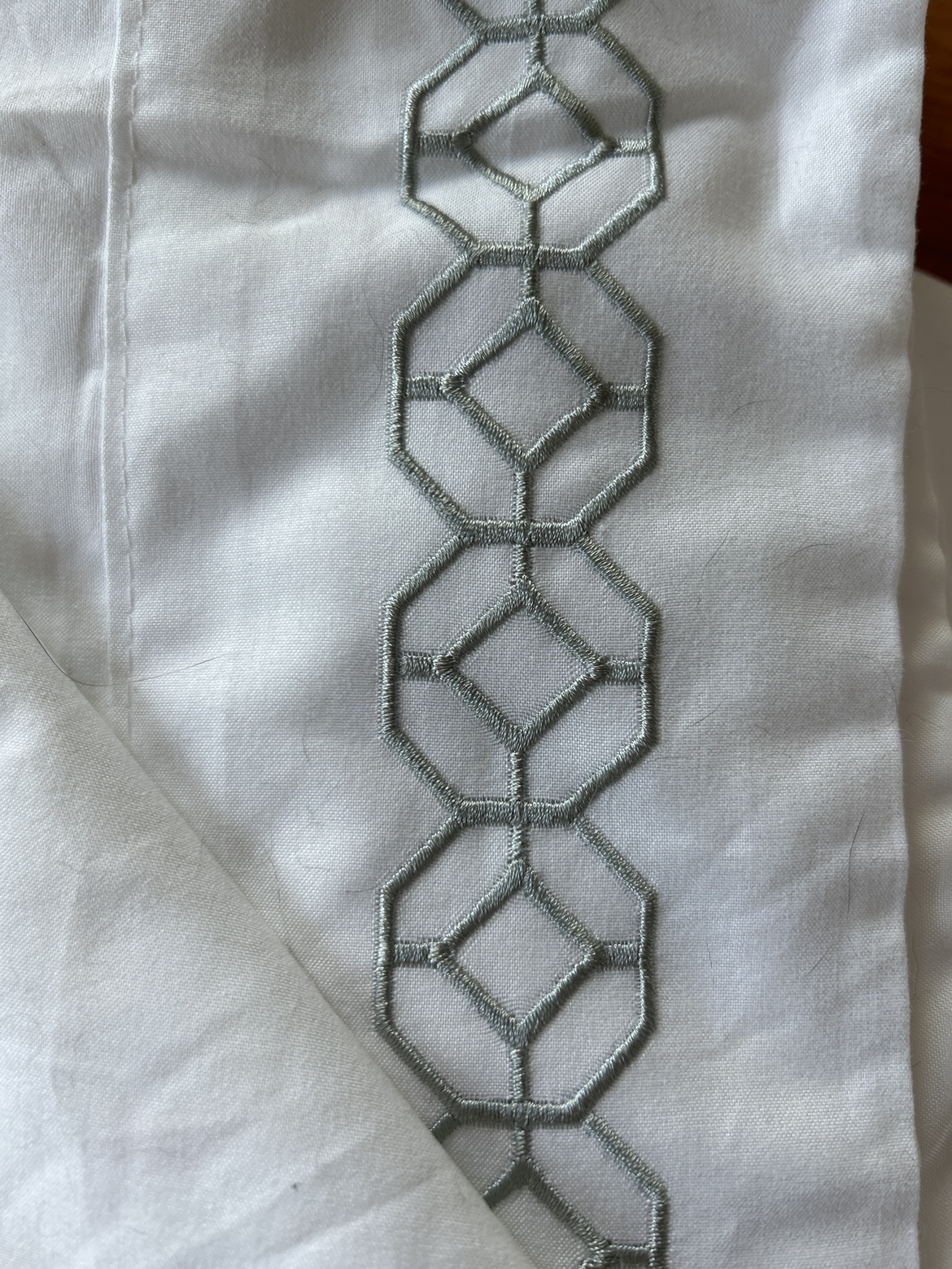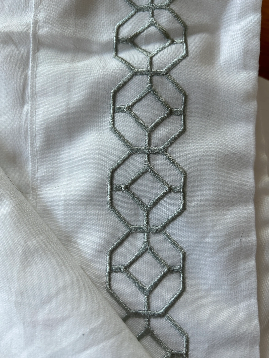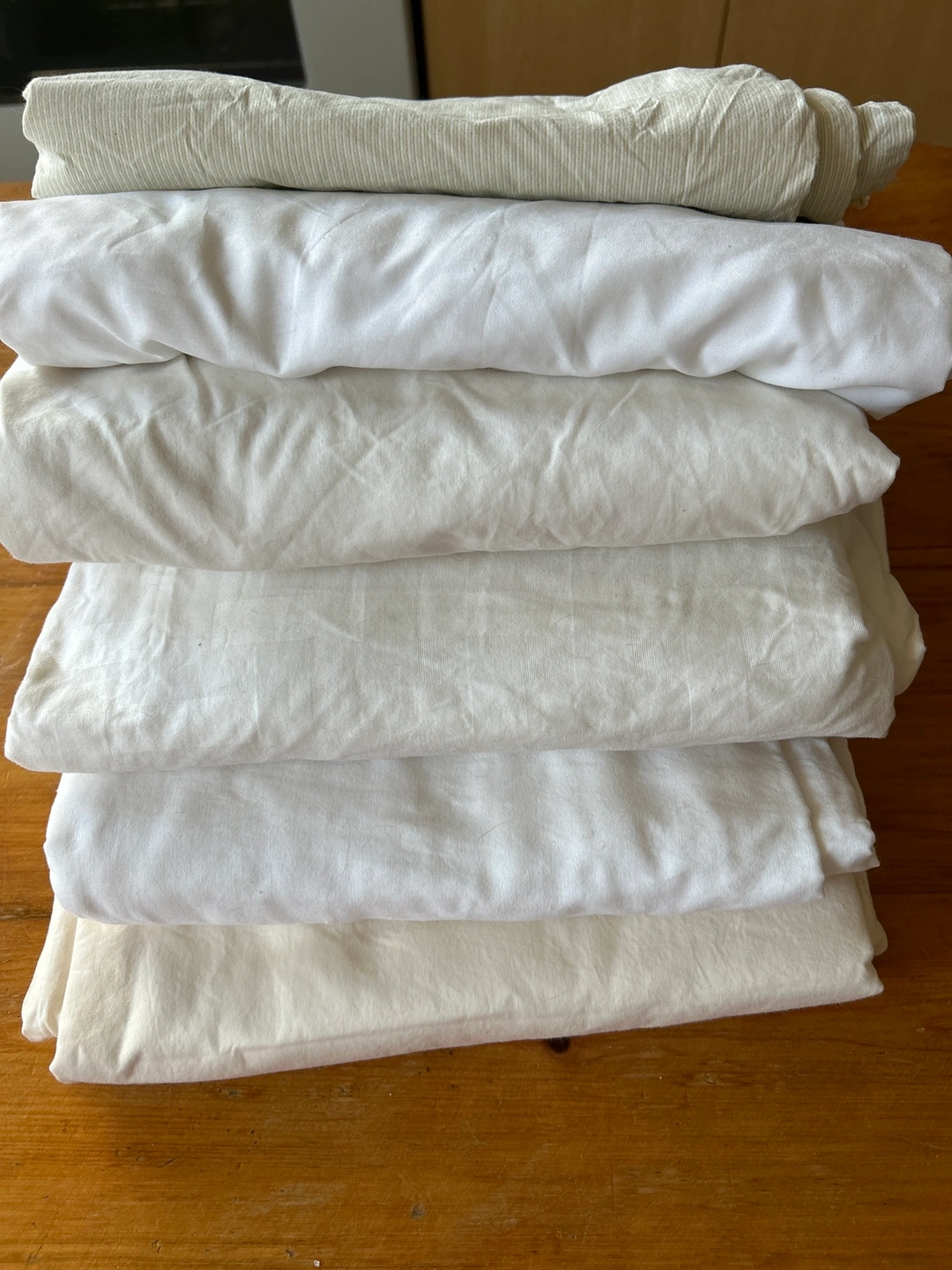 Lightly used. Laundered but have been stored for a while Bundle of 6 flat sheets in various shades of off white. Includes a striped sheet in green and a white sheet with a woven in pattern. All cotton except the white one with green border which is microfibre. No tears or stains I am aware of.