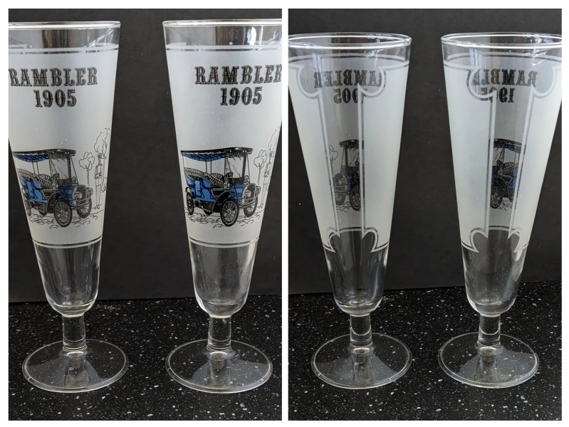261Frosted antique Rambler 1905 & Studebaker footed pilsner glasses