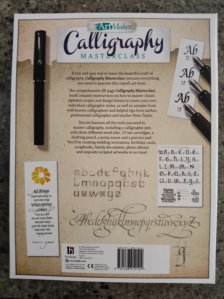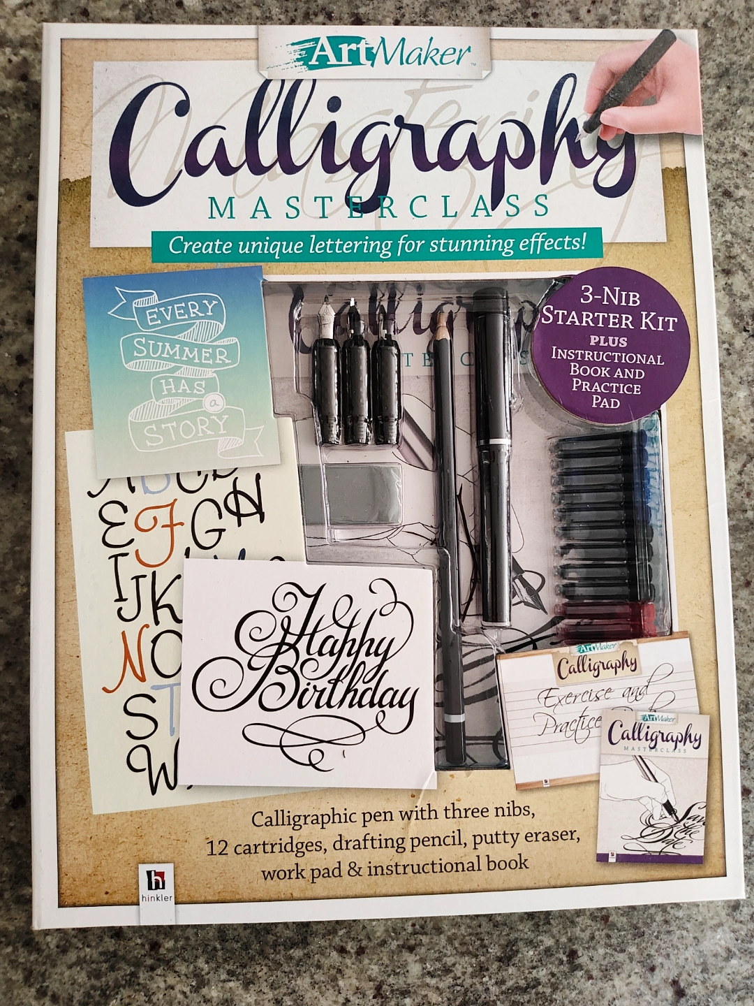 Calligraphic pen with three nibs, 12 cartridges, drafting pencil, putty eraser, work pad & instructional book