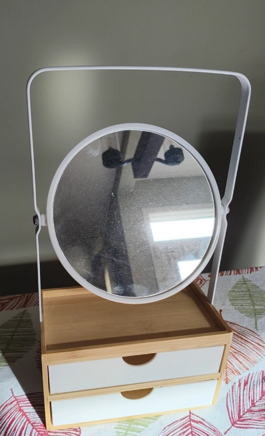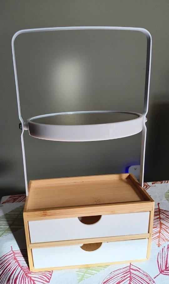 Bamboo and white makeup organizer with two drawers and a mirror. The mirror is attached to a stand that can be adjusted. There is a handle on top.