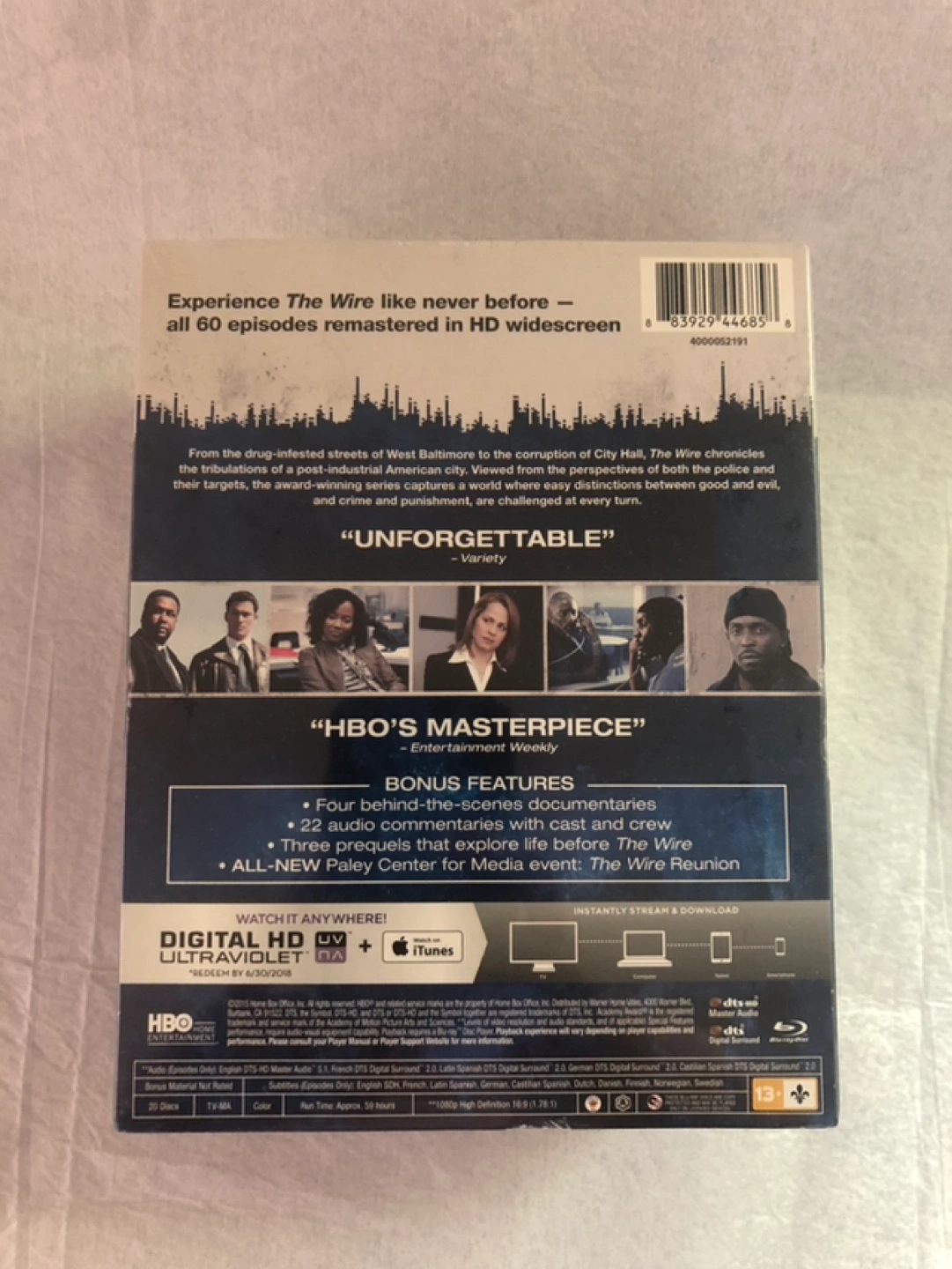 Blu-ray disc set of the complete series of The Wire. All 60 episodes remastered in HD widescreen. Includes bonus features, behind the scenes documentaries, and audio commentaries.