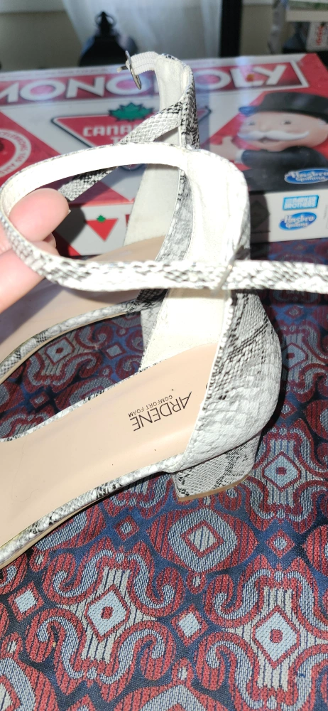 White and black snake print block heel sandals. Ankle strap with buckle closure. Never worn outside, tried on but not my style. 1 1/2 inch block heels.