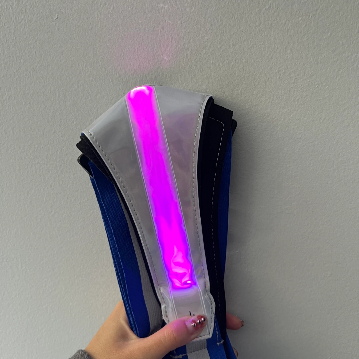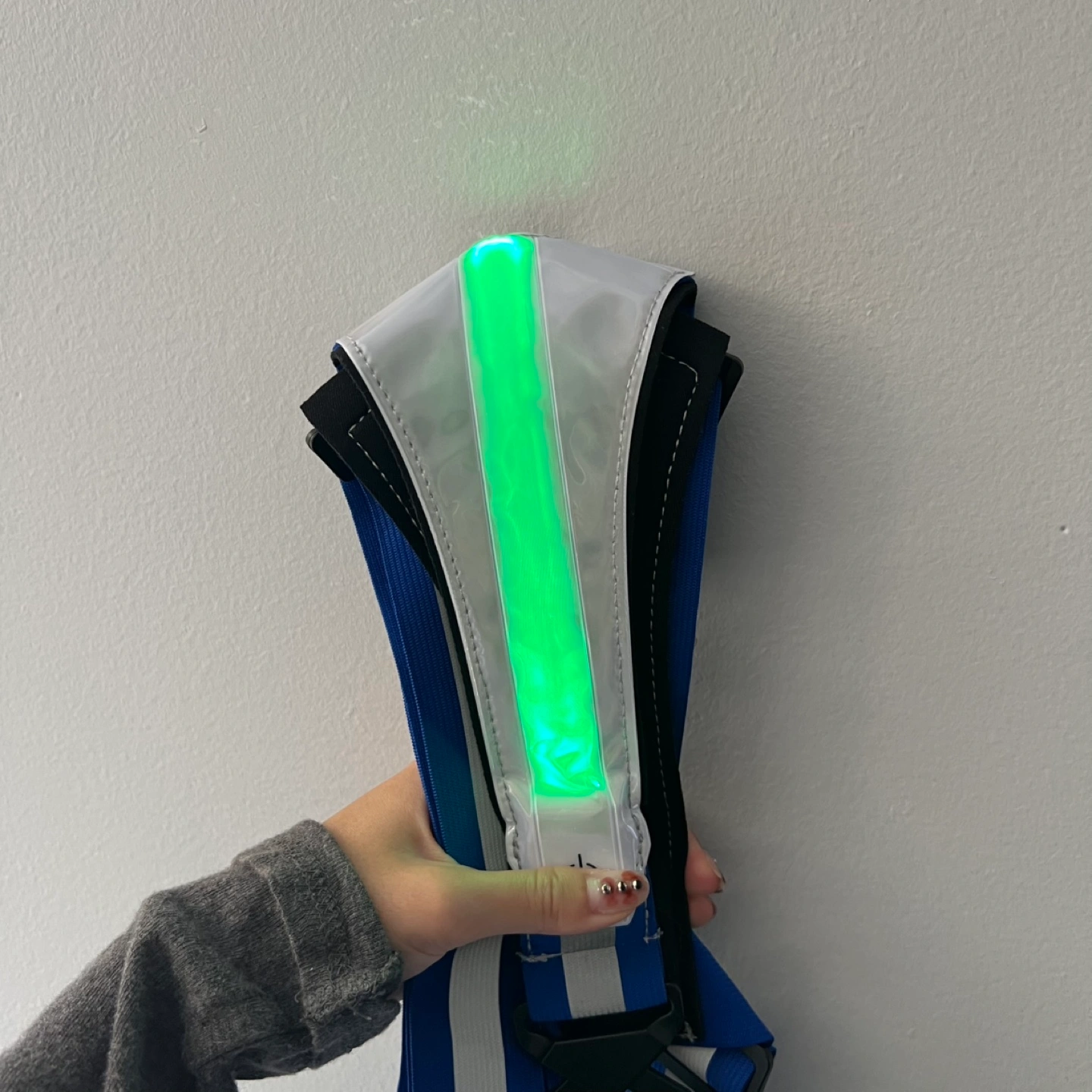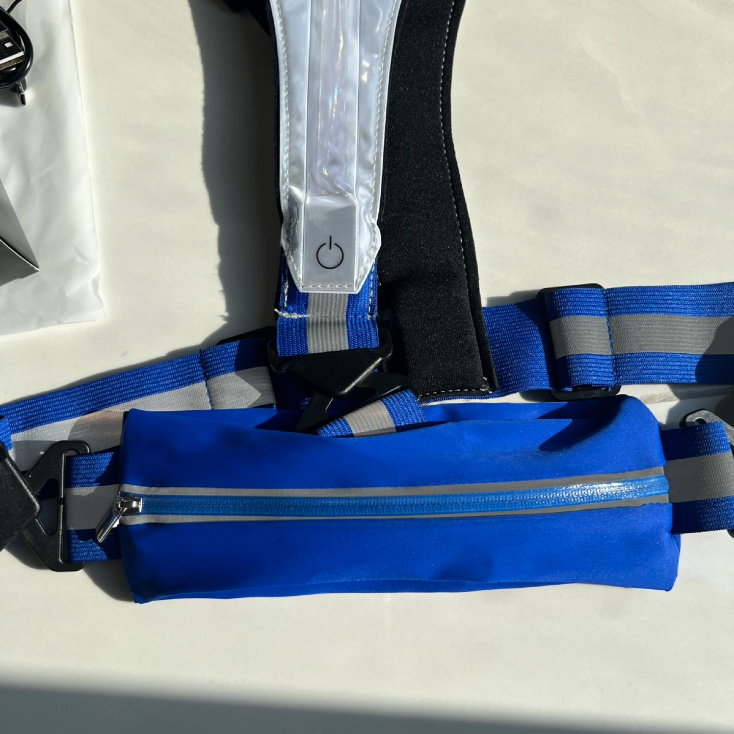 Features a small zippered pouch on the front. Different light colour options, can be a solid colour or flash. Comes with charging cable.