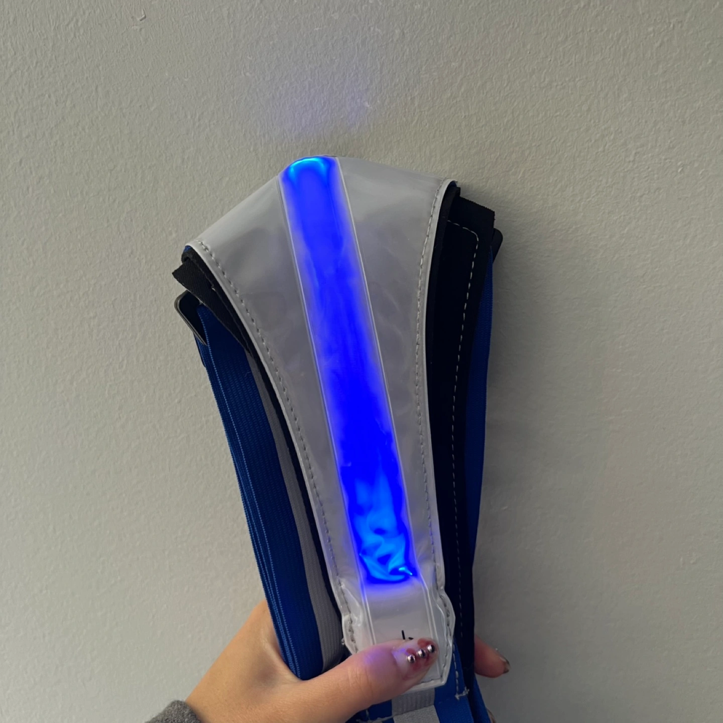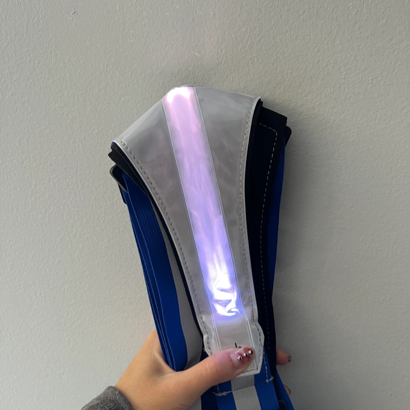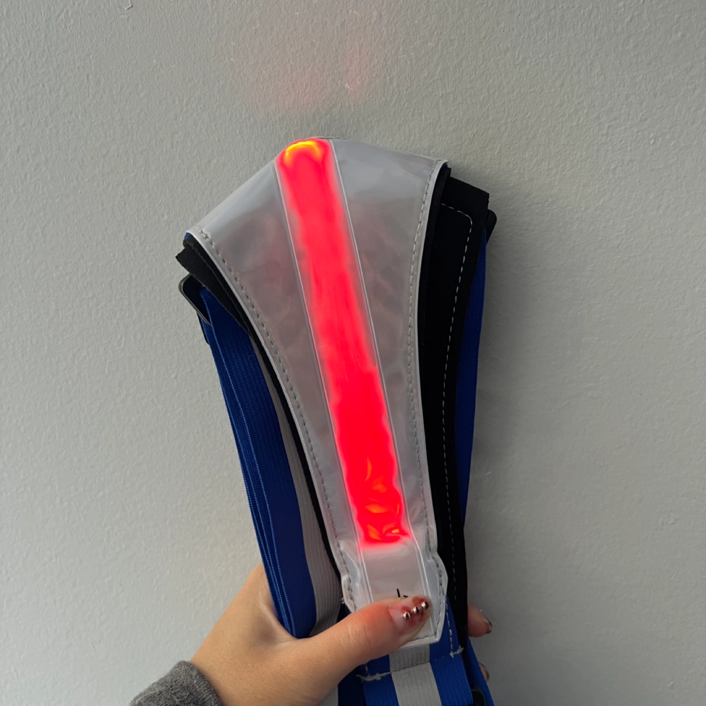 Features a small zippered pouch on the front. Different light colour options, can be a solid colour or flash. Comes with charging cable.
