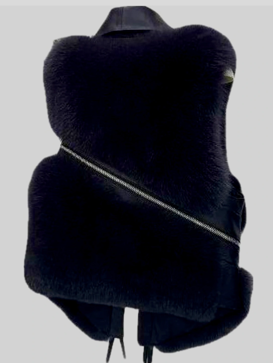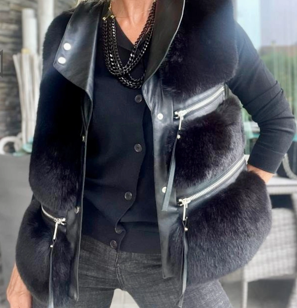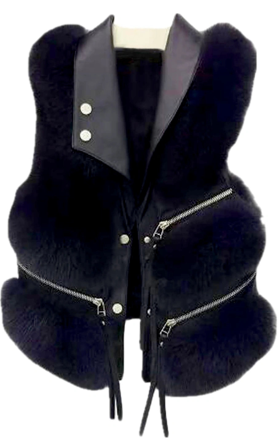 Black faux fur vest with leather trim and zipper accents. The vest has a moto-style collar. It fastens with snaps and has a drawstring at the bottom.