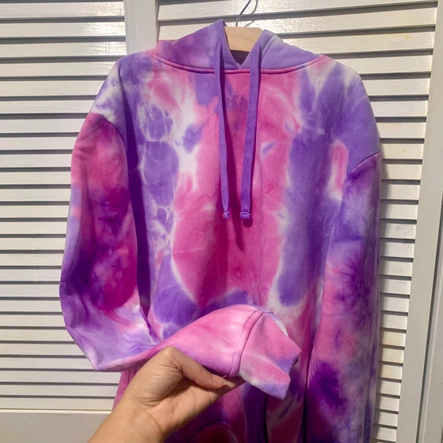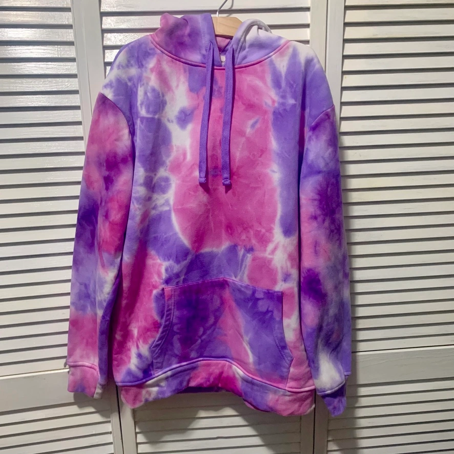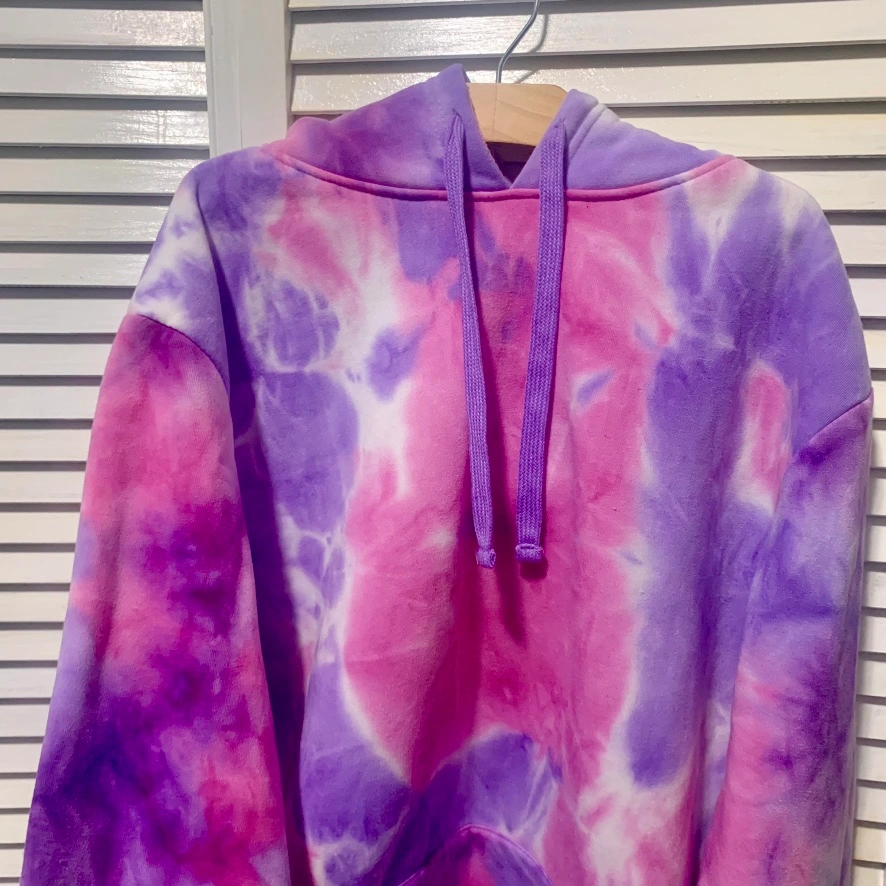 Purple and pink tie dye hoodie with a front kangaroo pocket.