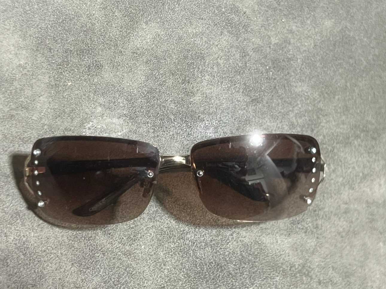 Brown sunglasses with rhinestones. Gold metal frame. No case. Used but in good working condition, please see photos.