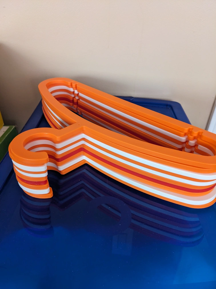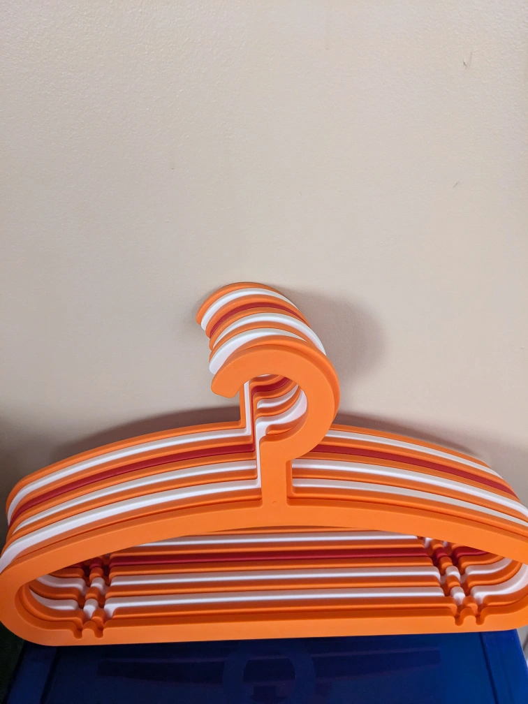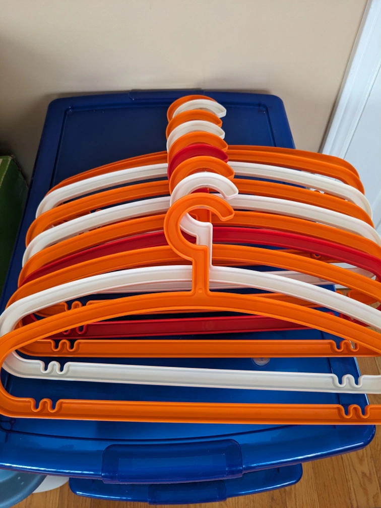1000+Set of 10 orange and white plastic hangers, excellent condition.