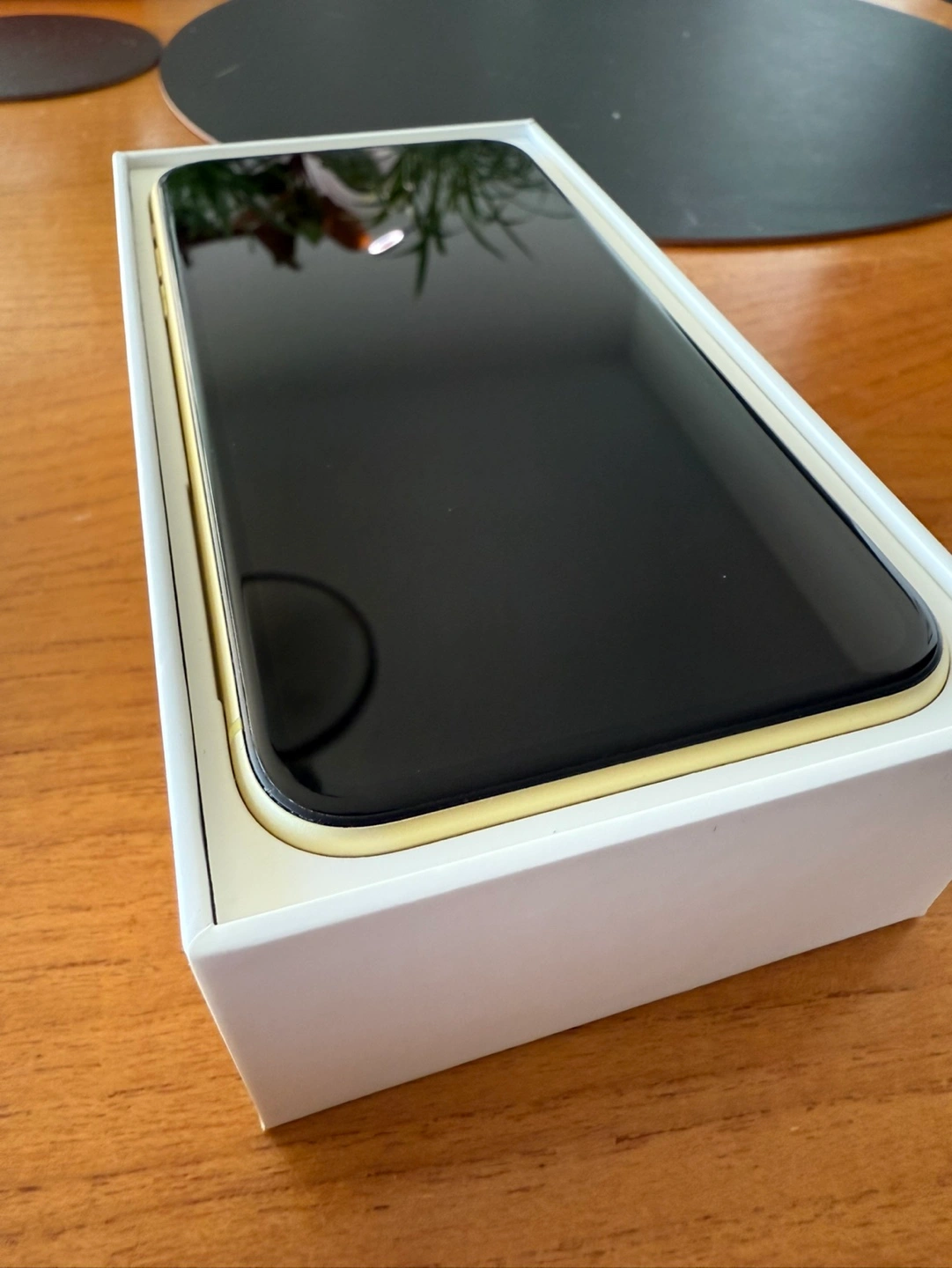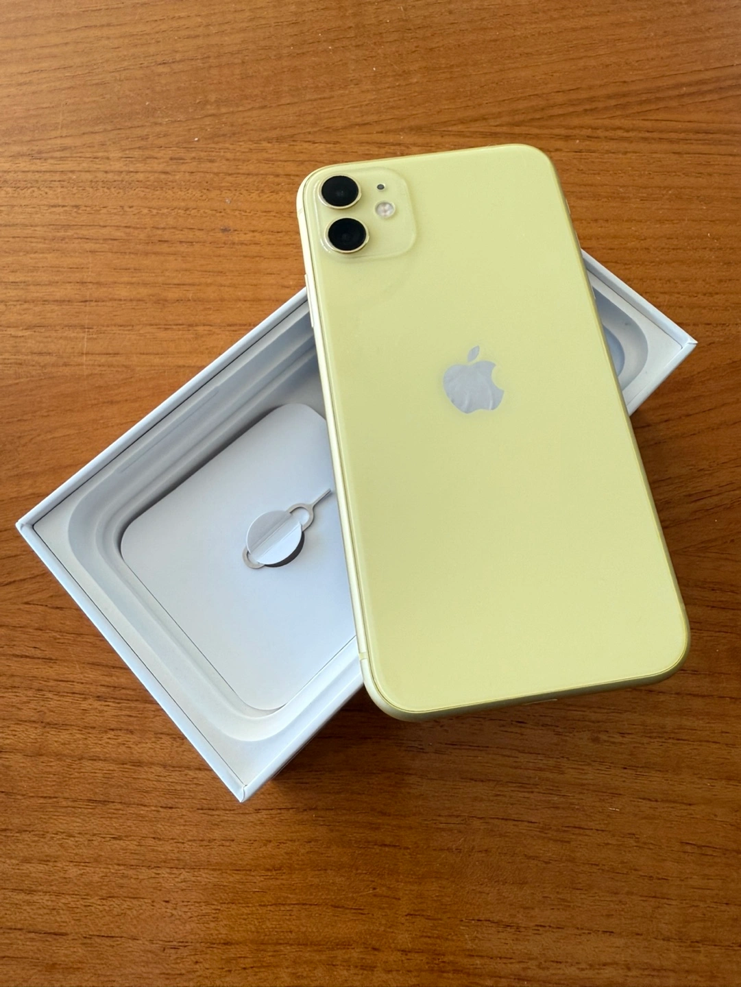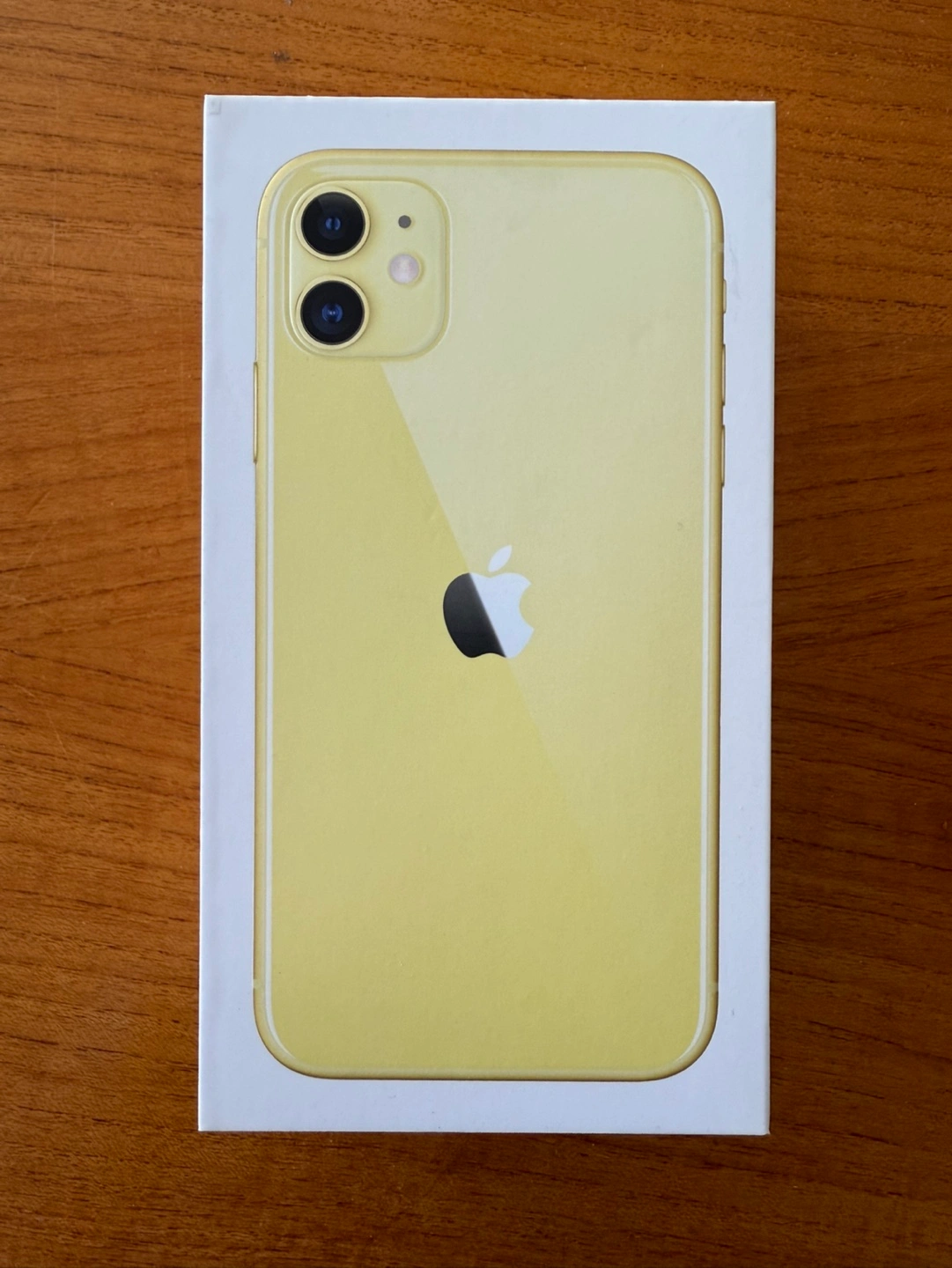 Yellow iPhone 11 with 256 GB storage. Comes with original box, SIM card pin, and a charging cable. Body and screen in excellent condition.