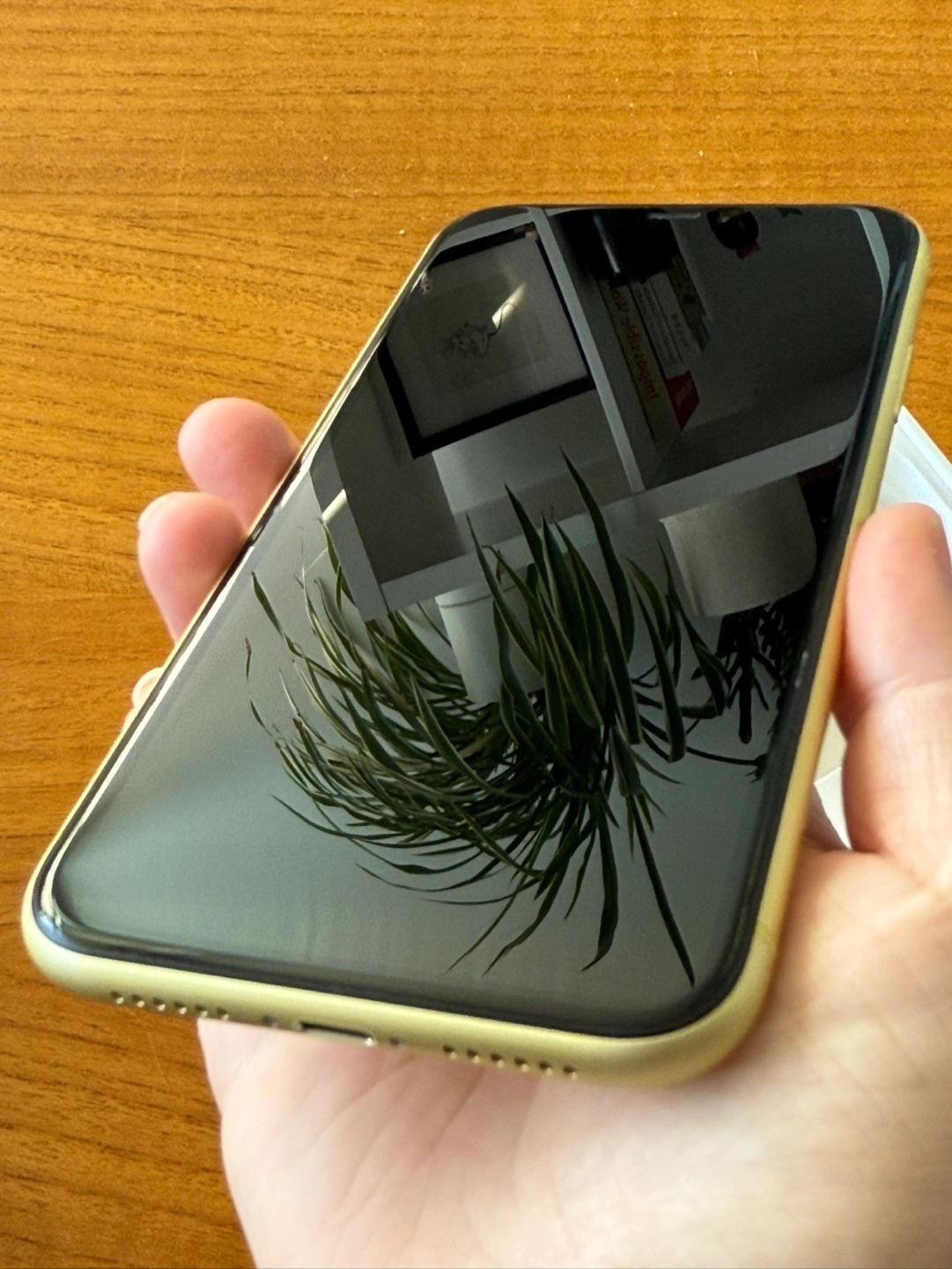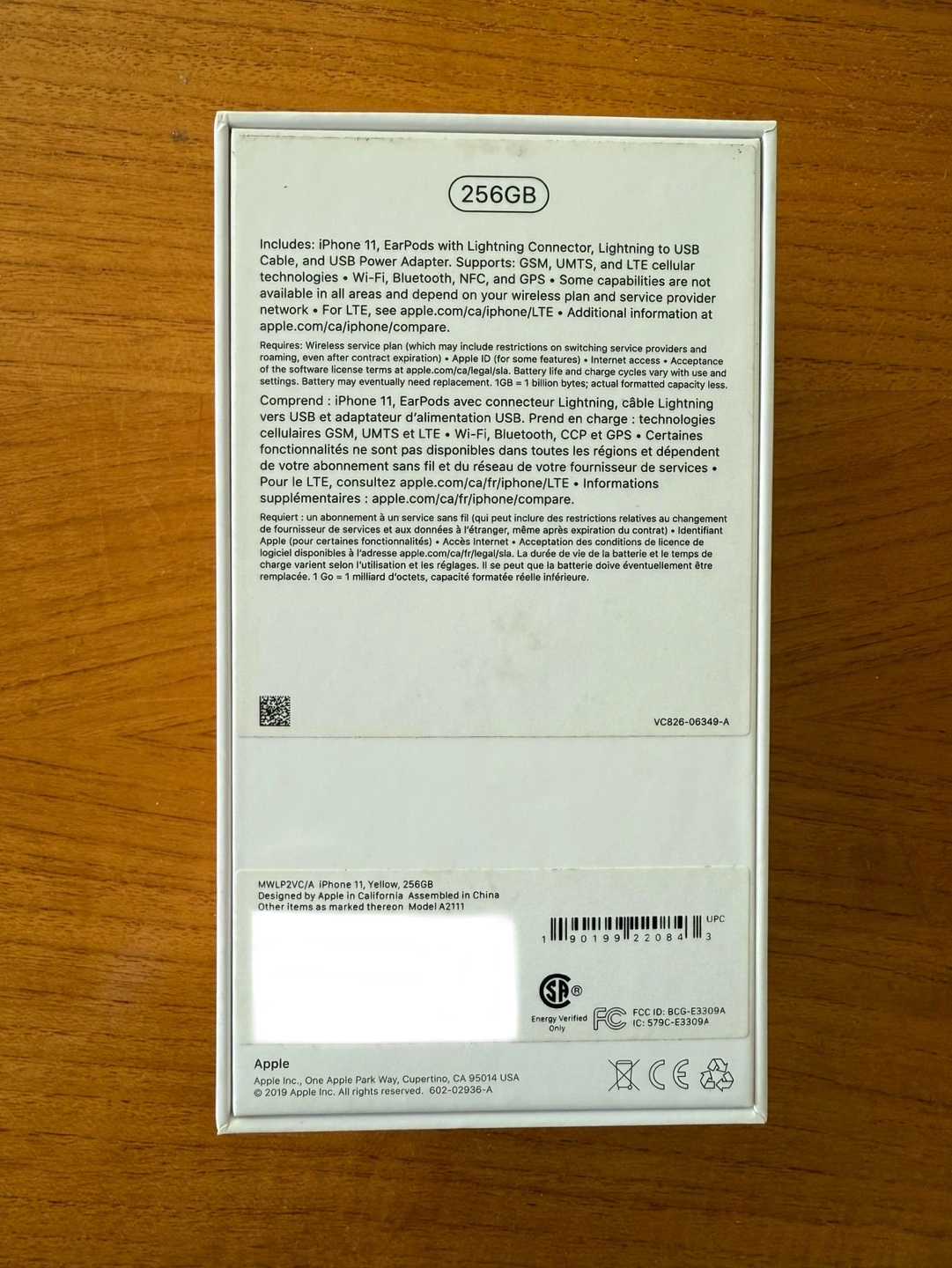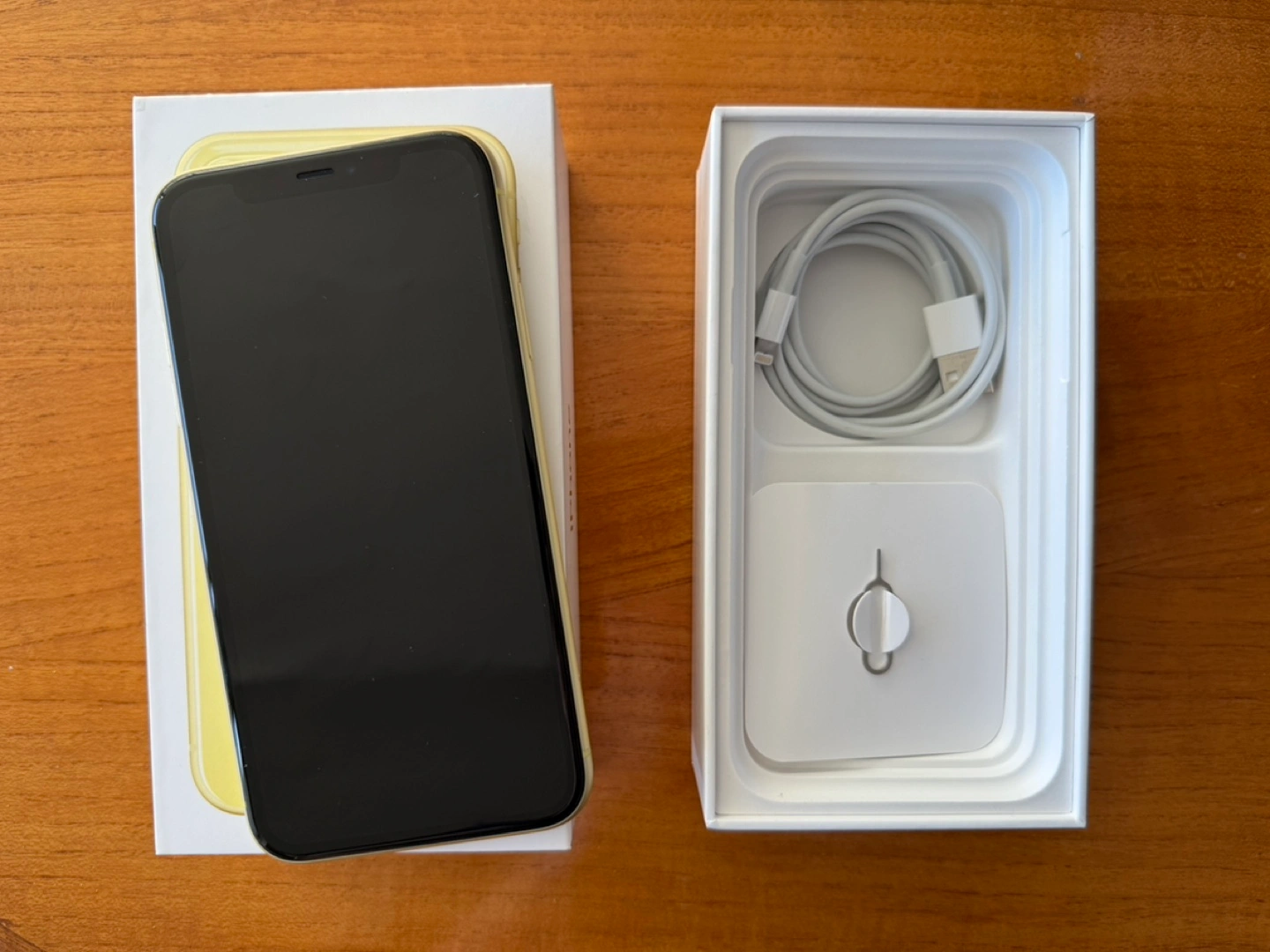 Yellow iPhone 11 with 256 GB storage. Comes with original box, SIM card pin, and a charging cable. Body and screen in excellent condition.