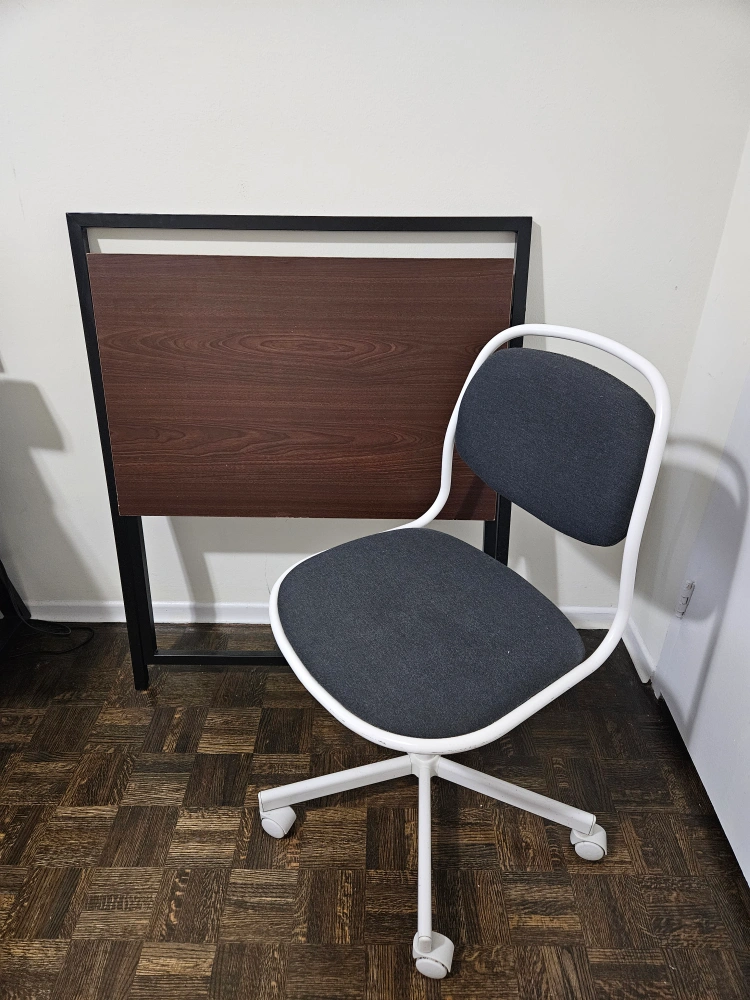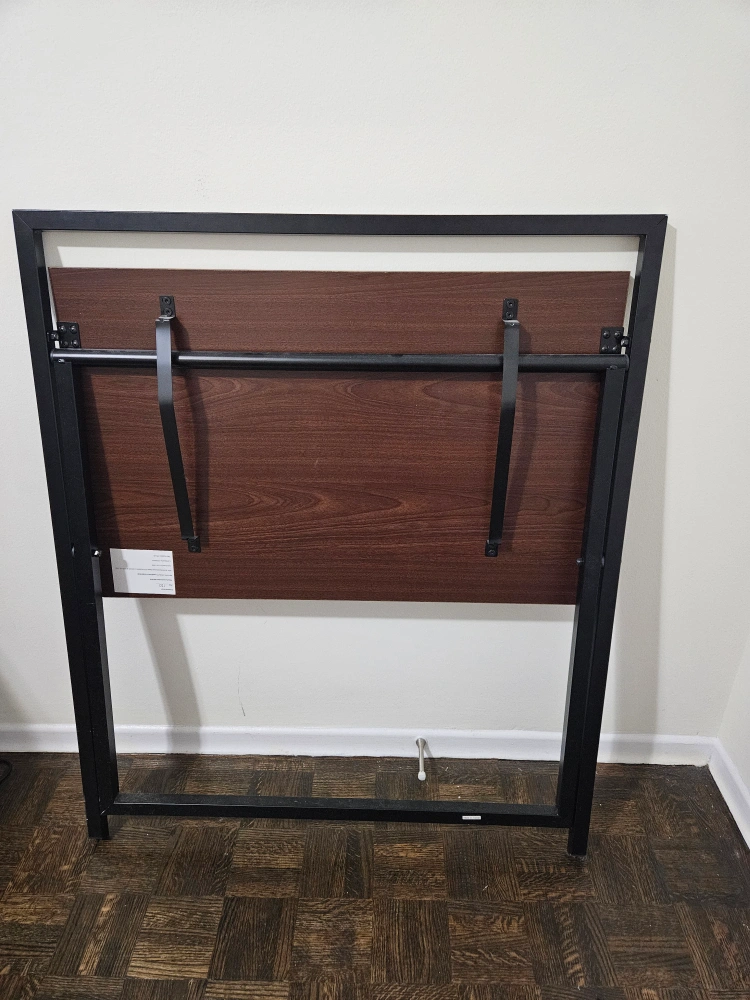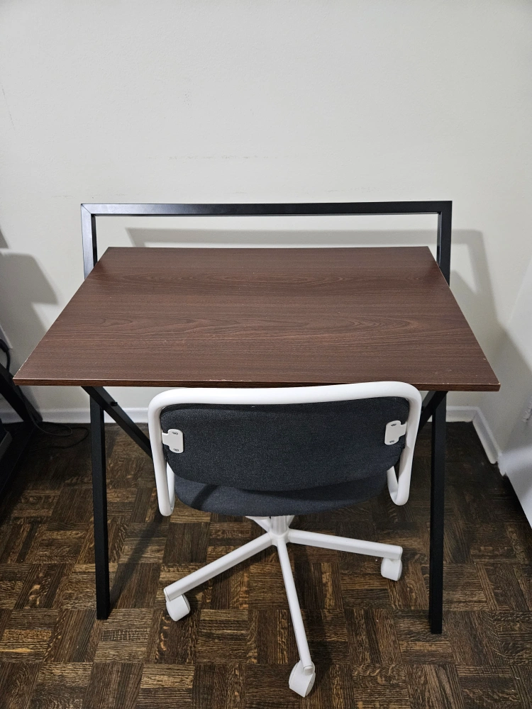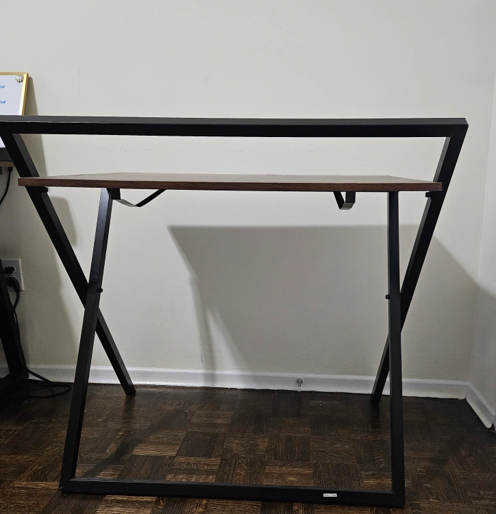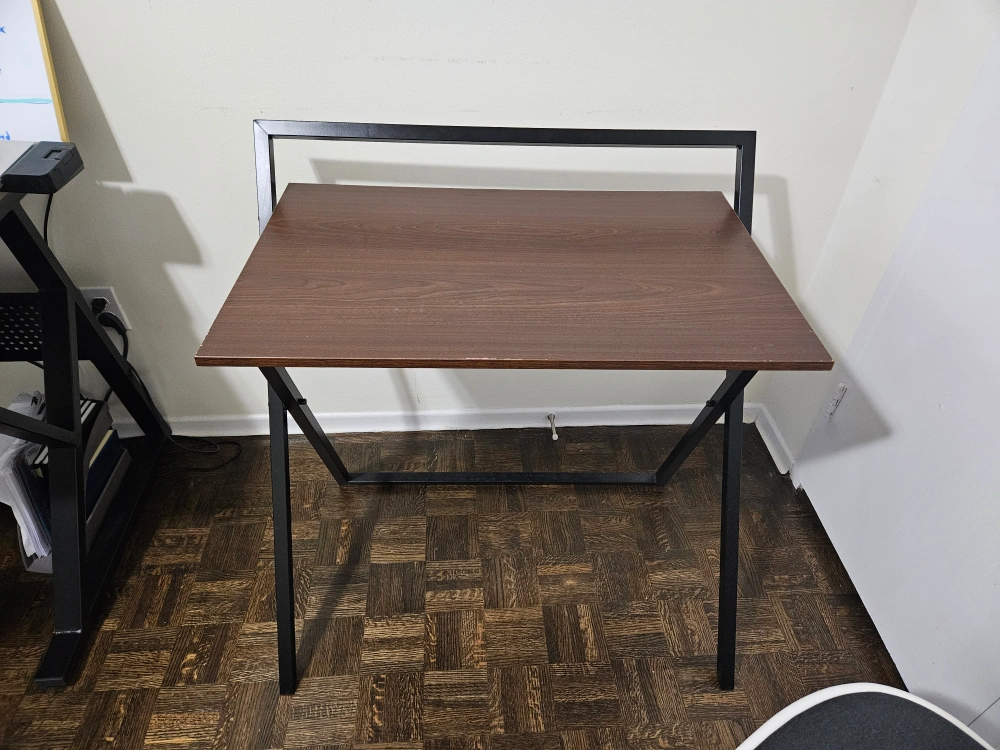 Medium-sized folding desk with a black metal frame and a brown tabletop. Folds up for easy storage, great for small rooms. You can comfortably keep a laptop, book and still have plenty of space for other stuff. Ikea chair comes free with the table. Brought new tables hence selling this one table which is in a great conditiob.