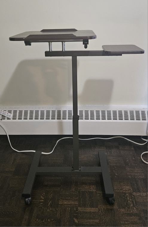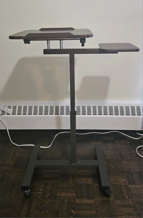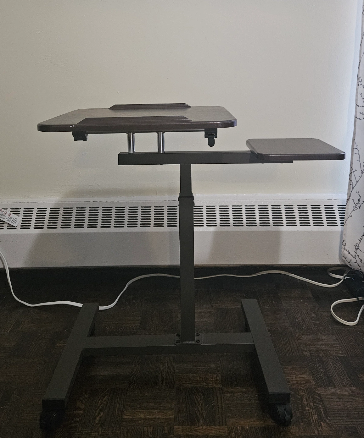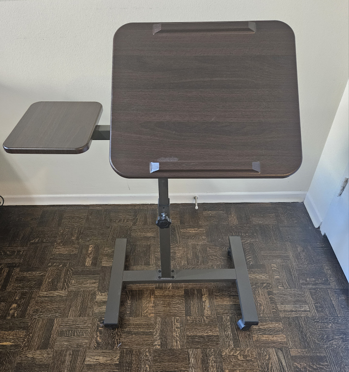Height-adjustable from 27.5 to 40 inches and rolling desk. Walnut colour wood and metal frames. Enough space to keep a laptop only with mouse pad table.
