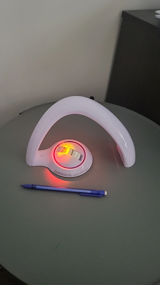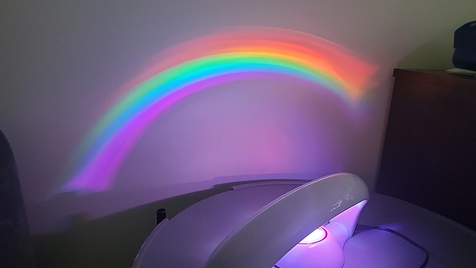 Projects a rainbow onto the wall. Has multiple light settings. Works with batteries.