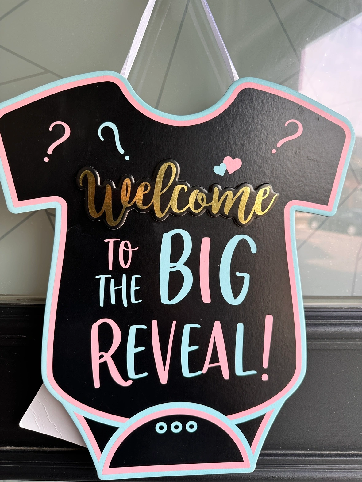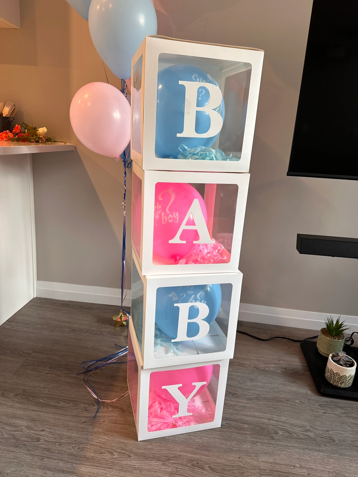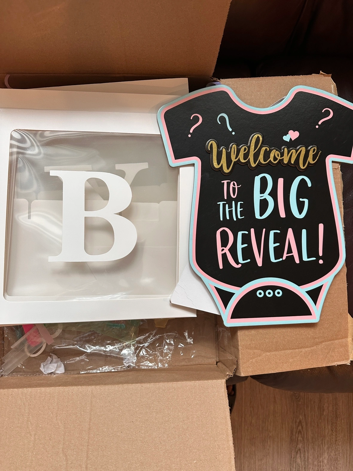 Set of gender reveal party decorations, including a four-tiered box, a sign, and other smaller decorations. All decorations are in pink and blue colours.