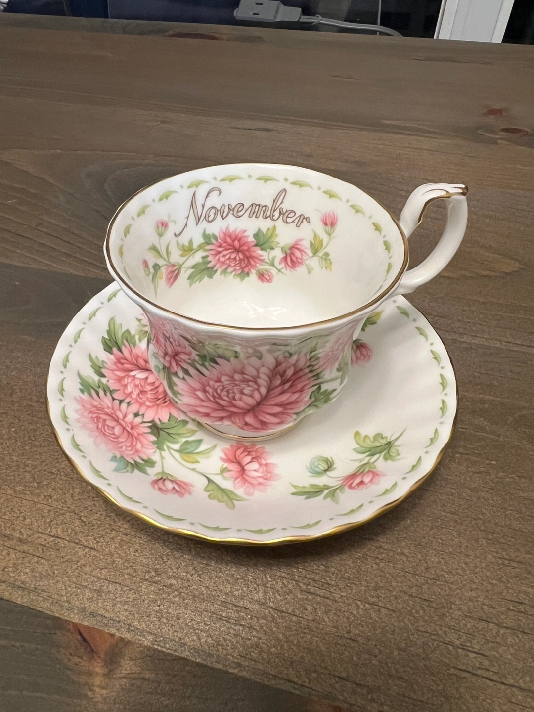 November Teacup and saucer featuring pink flowers. Gold trim.