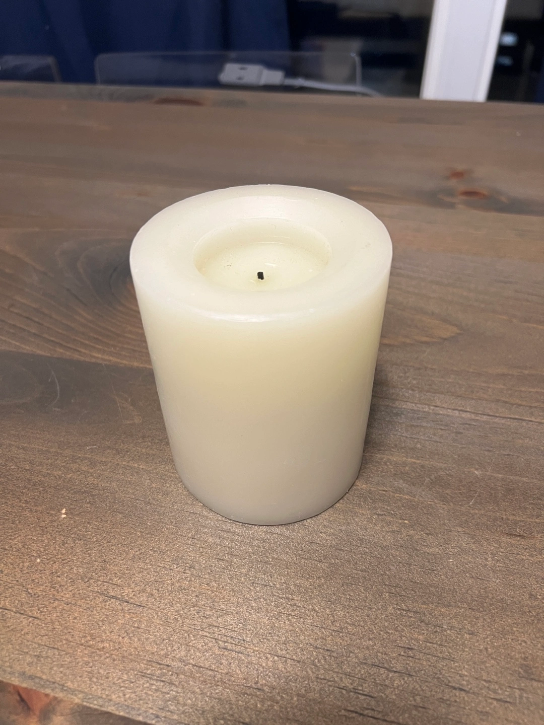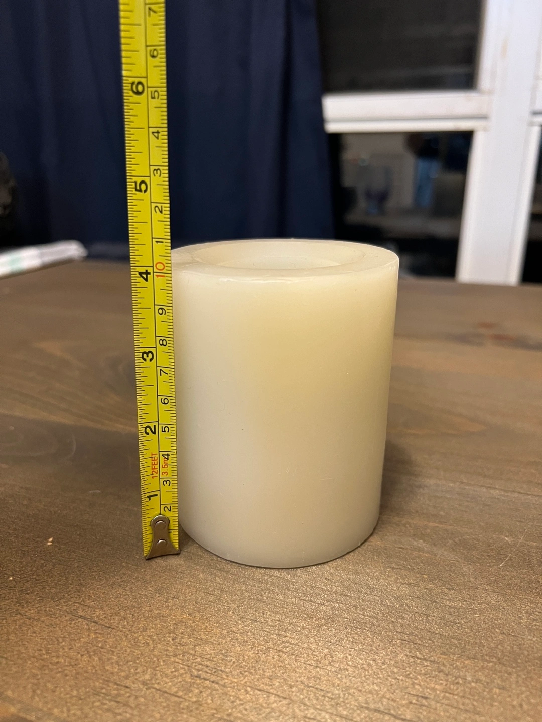 White, battery operated candle. Takes 2 C batteries. Measures 3 inches in diameter, 4 inches tall