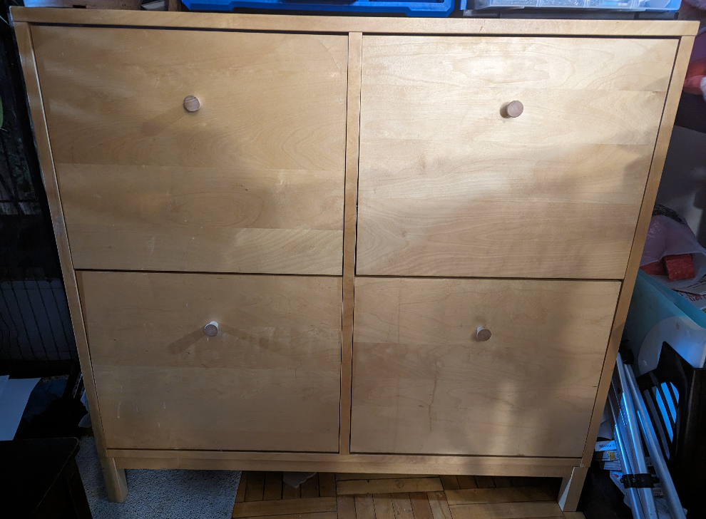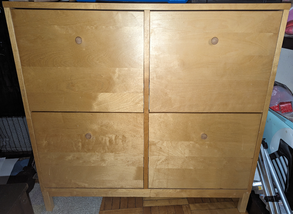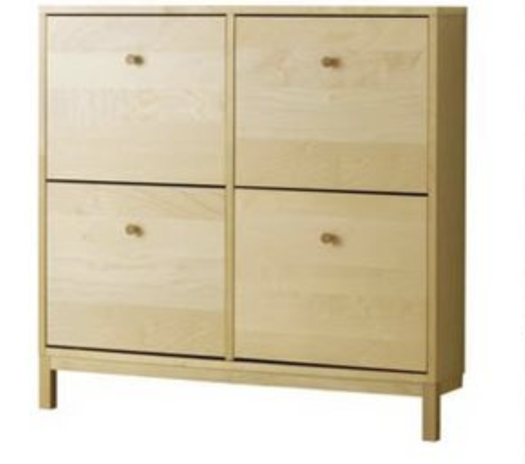 should be the Sandnes shoe cabinet from Ikea, four door storage cabinet leans against wall