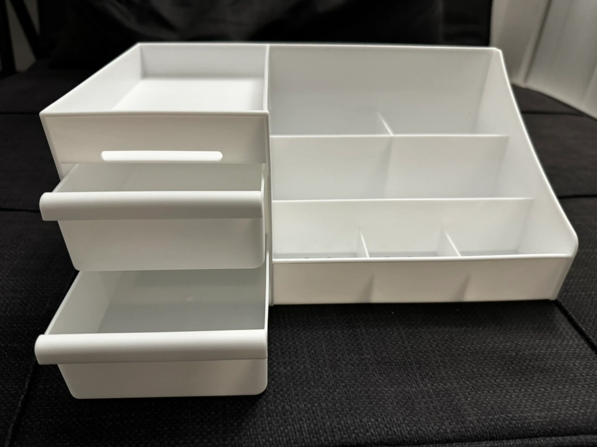 This beautiful white plastic makeup organizer comes with two drawers. Has various compartments for organizing your makeup bottles, brushes, pencils, notepads, etc. Perfect for your desktop or bathroom counter.