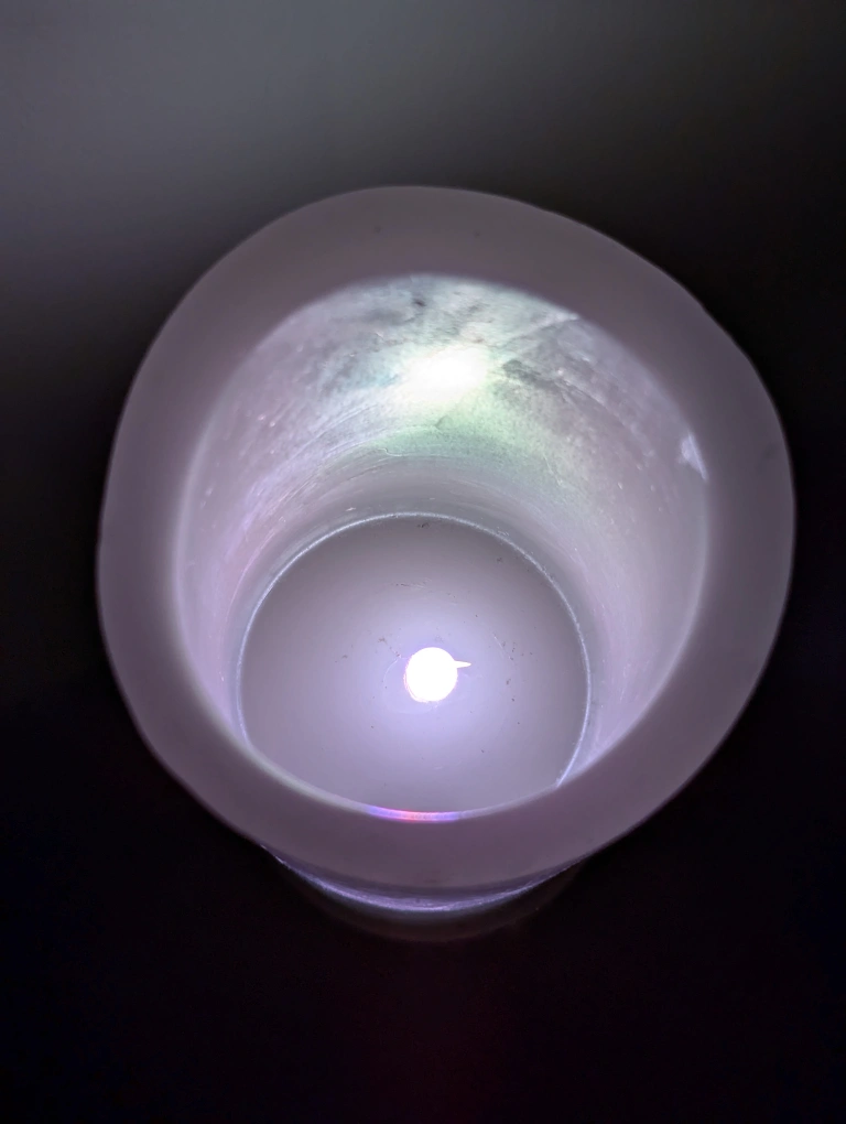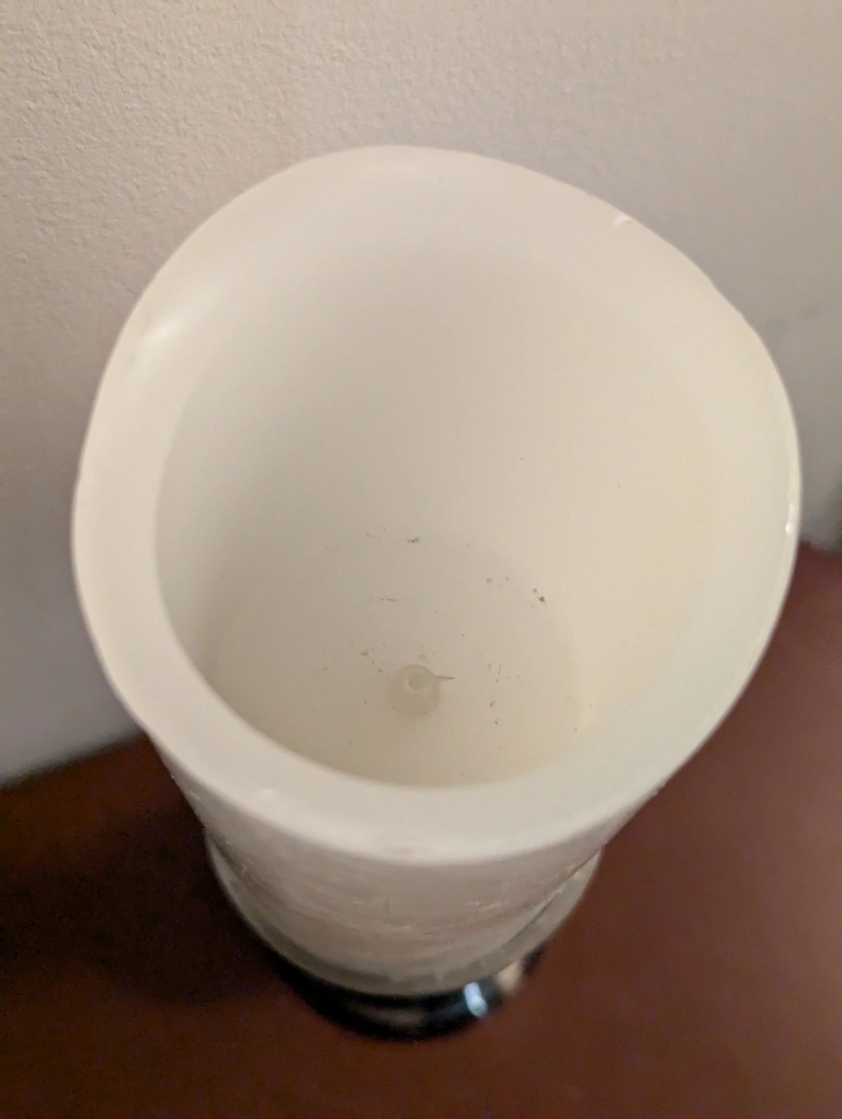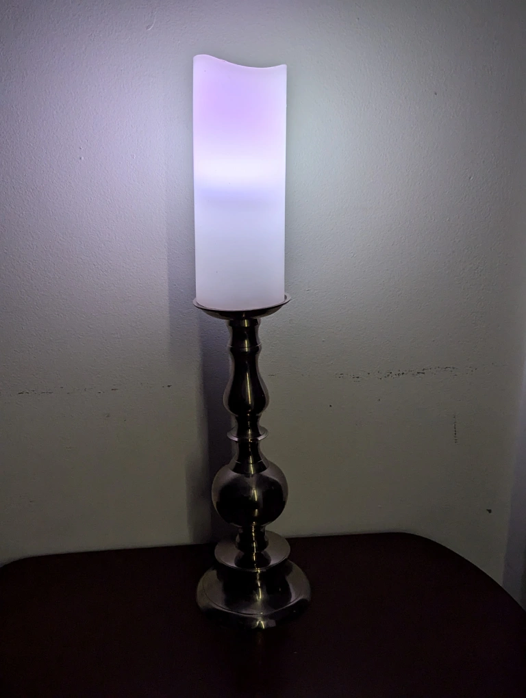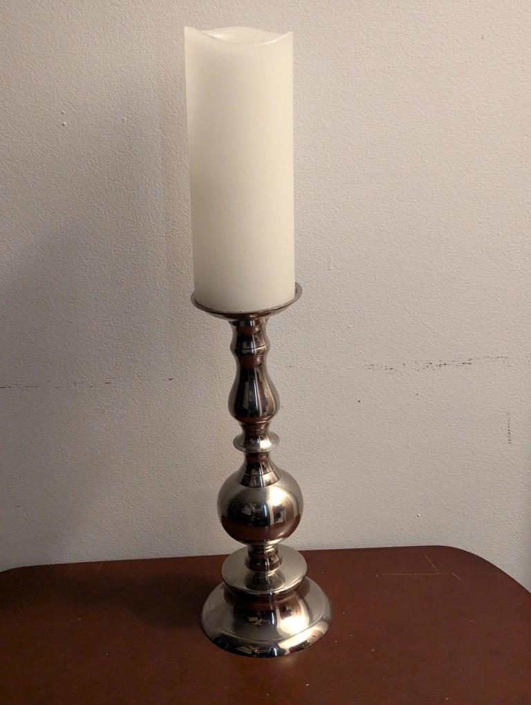 This is an LED candle with a sturdy metal stand. The candle looks like a traditional candle (it's even made of wax!) but it's battery-operated. The light is cool-coloured, with a hint of green on one side and purple on the other (which doesn't show up in the picture).