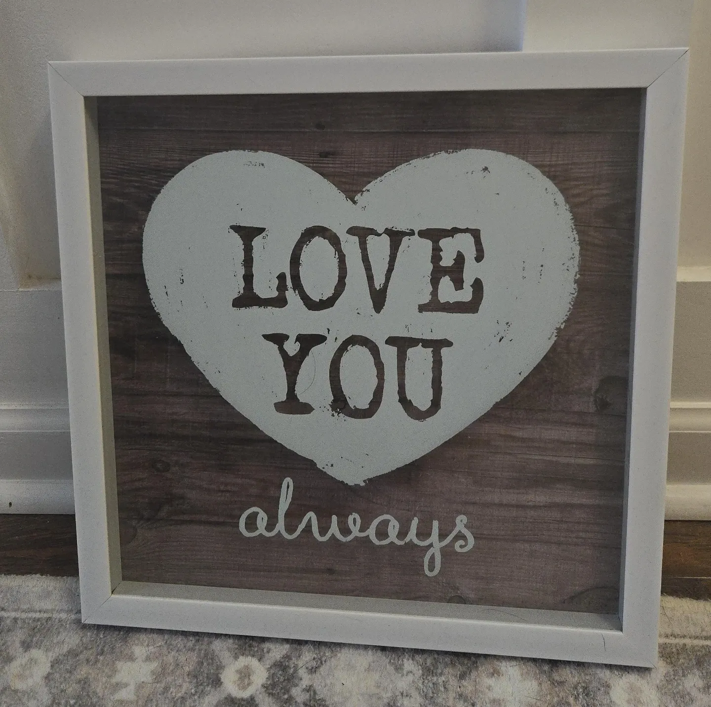 This framed wall art features a white heart with "Love You" in distressed brown font on a wood-look background. "Always" is written in cursive below. It's a sweet piece for home decor! Ready to hang.