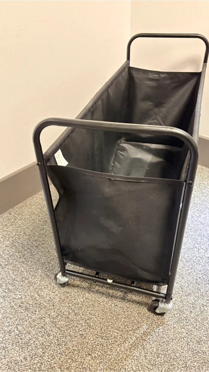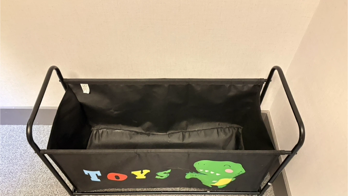 Black fabric storage cart with a cute dinosaur graphic and 'TOYS' lettering. It's got wheels for easy moving around! Perfect for a kid's room or play area.