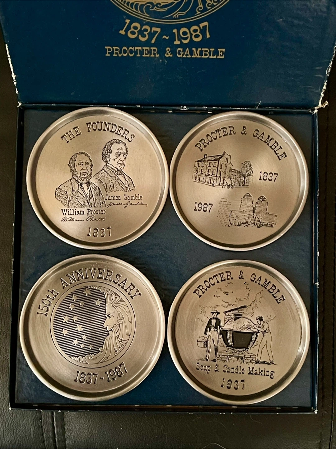 This is a set of four commemorative pewter coasters celebrating Procter & Gamble's 150th anniversary. Each coaster features a unique embossed design related to the company's history. The coasters are new and unused. The original box, which has some shelf wear is included, making it a great collector's item!