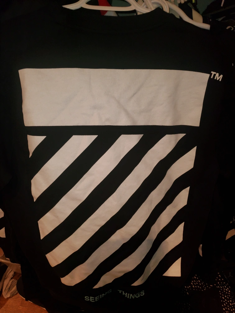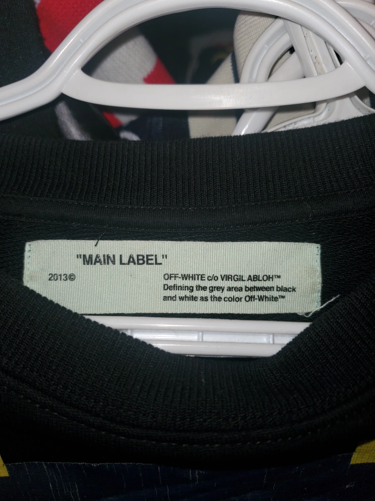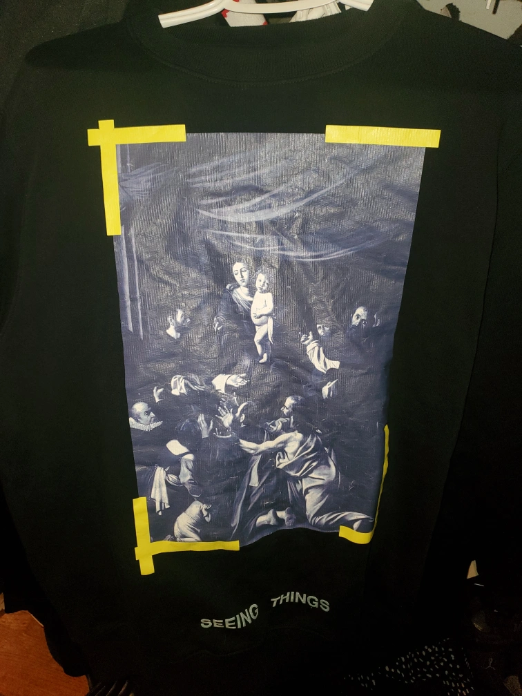 Black crewneck sweatshirt. Features a Caravaggio painting on the front, yellow tape accents, and Off-White signature stripes on the back. large