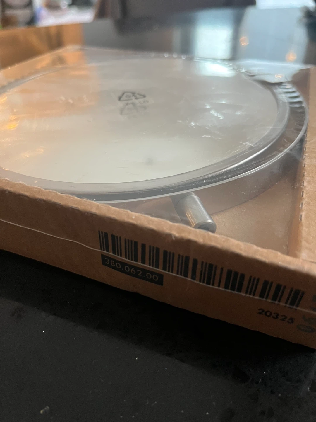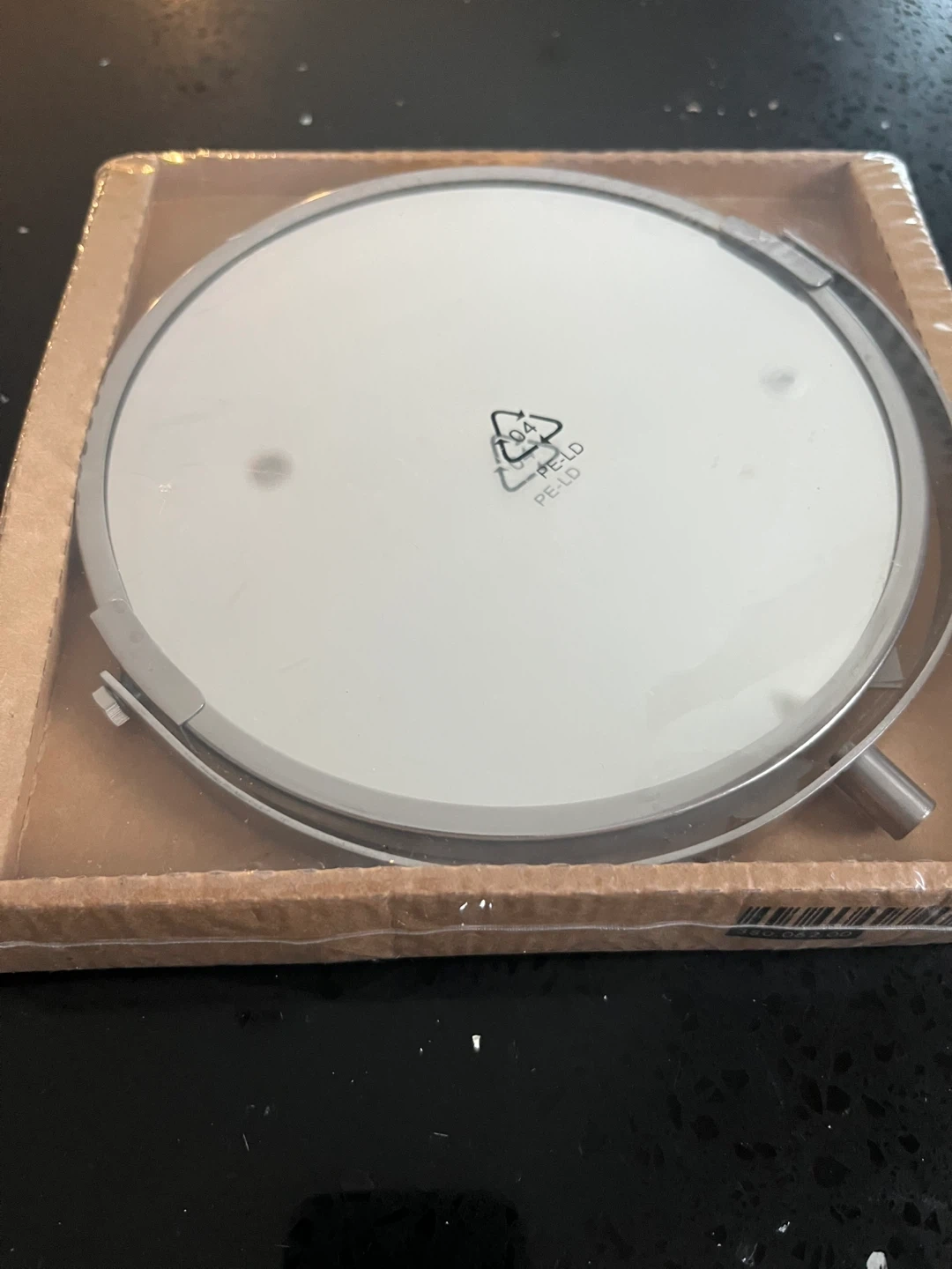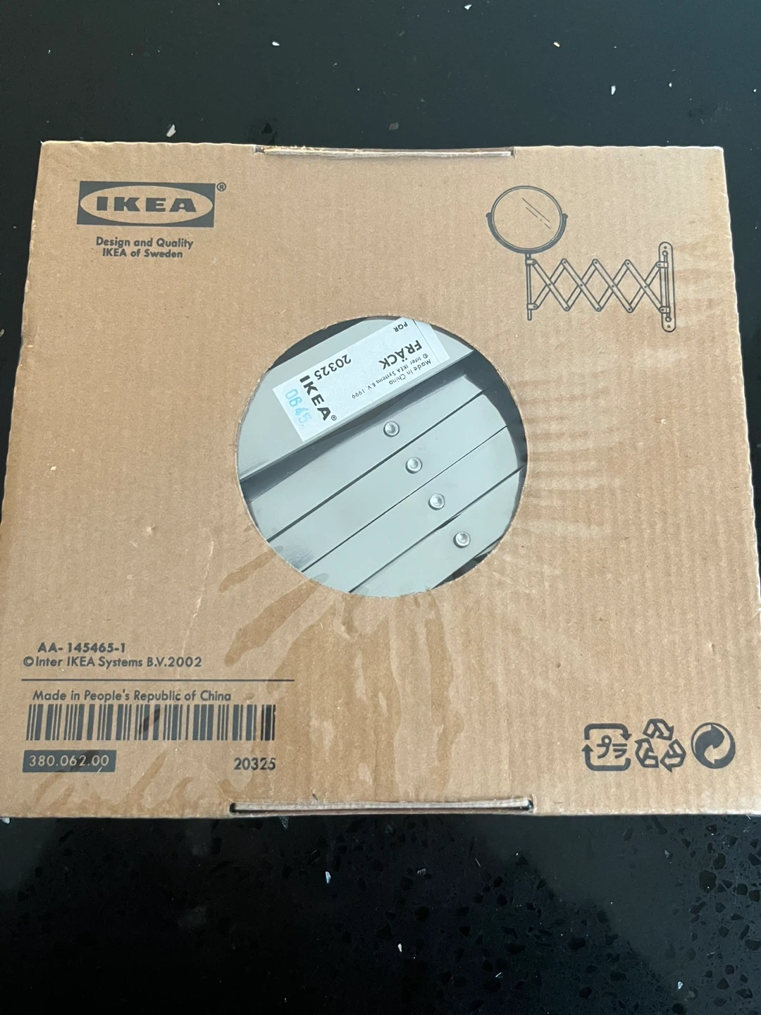 This is an IKEA FRACK mirror with an extendable arm. It's made of metal and plastic. The mirror itself is round and silver-toned. It comes in its original packaging.