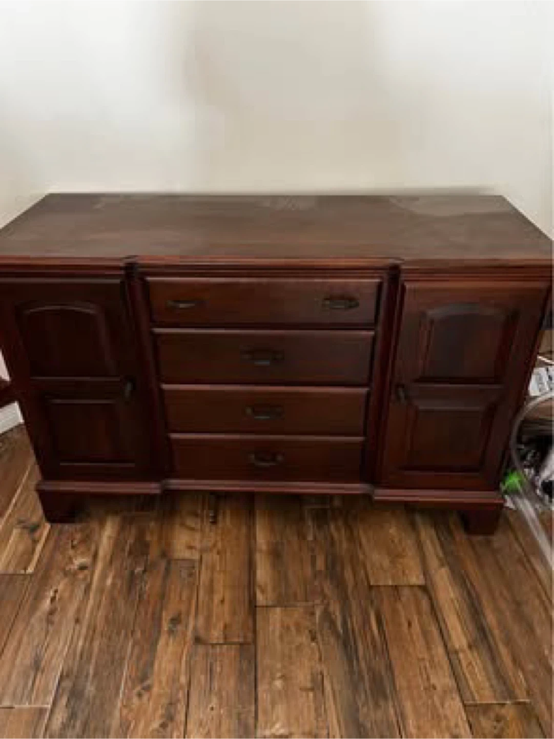 This is a solid wood sideboard or buffet with a rich, dark wood finish. It features a central bank of four drawers and two cabinets on either side, offering ample storage space. The hardware is a dark, antique-style metal. It's a sturdy piece that would be useful for dining room or living room storage.