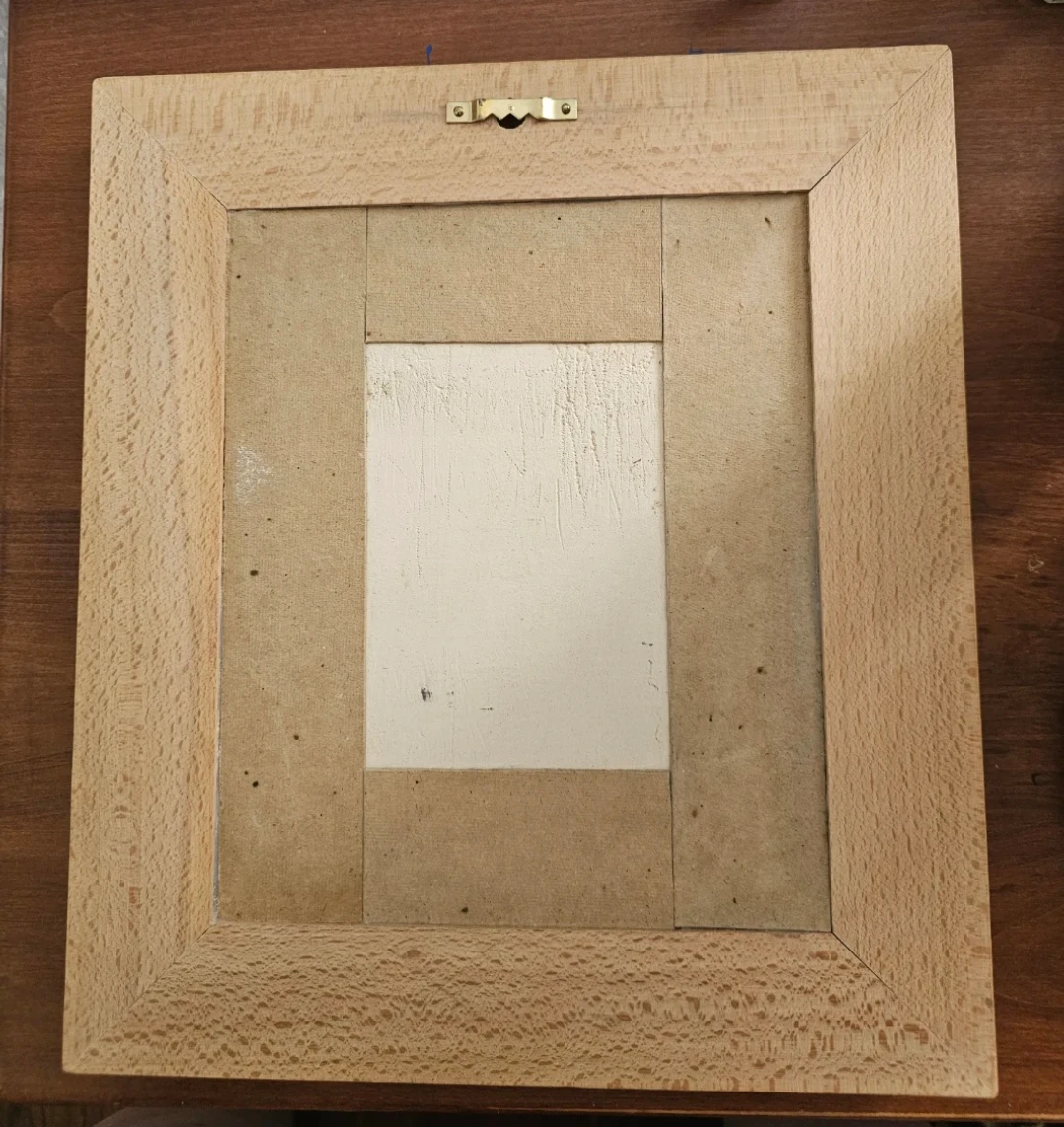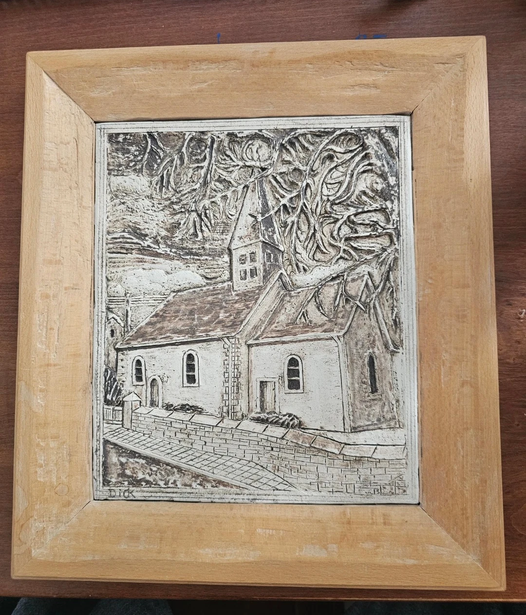This is a vintage framed bas relief artwork depicting a church scene signed by Dick.. The textured surface