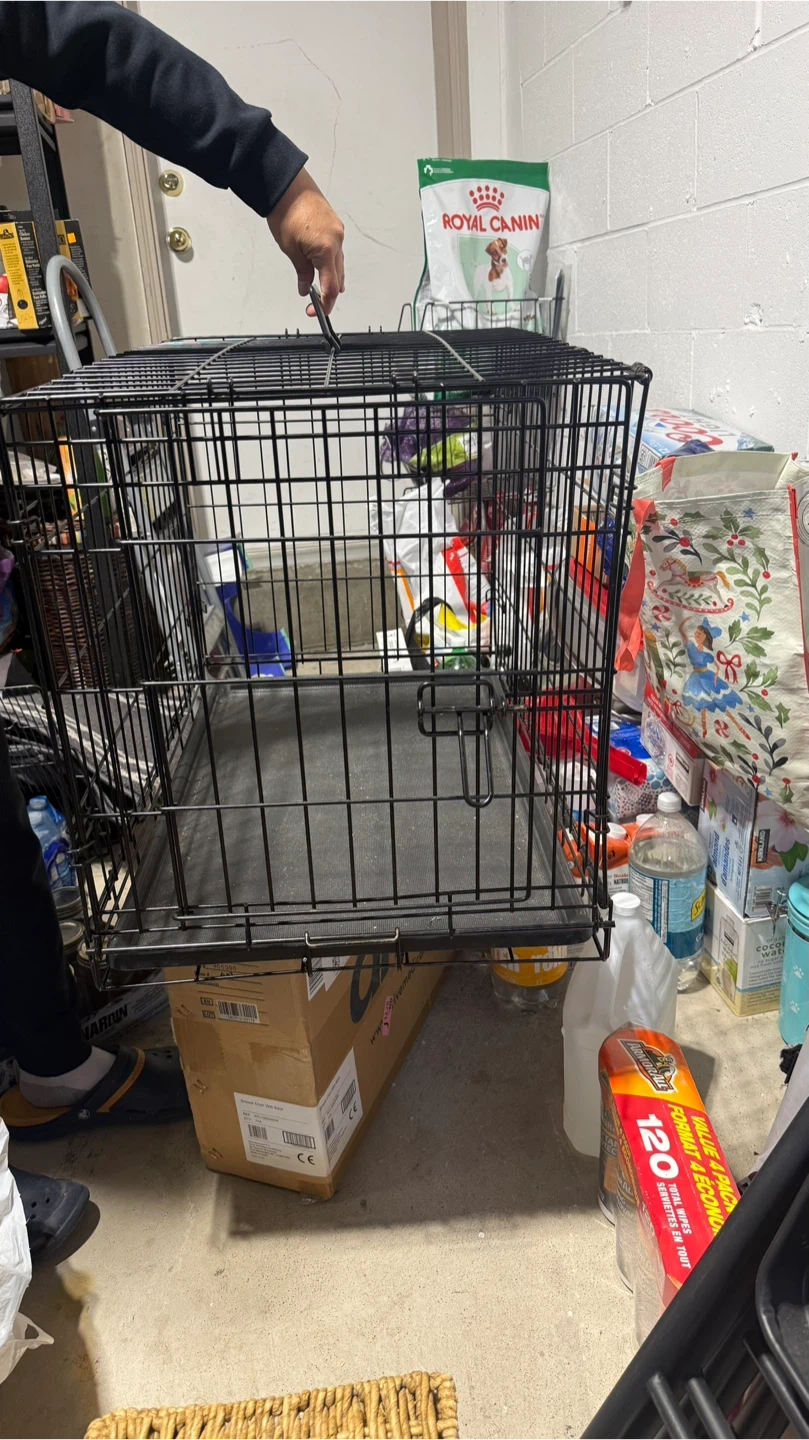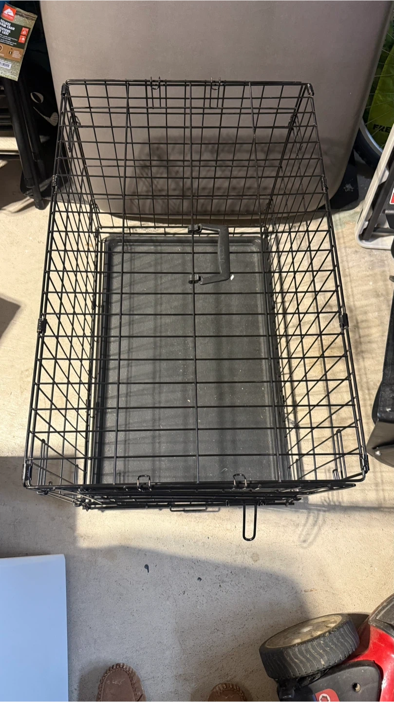This wire dog crate provides a safe and secure space for your pet. It comes with a durable plastic tray for easy cleaning. Folds flat for convenient storage and transport. Dimensions: 30" L x 19" W x 21" H.