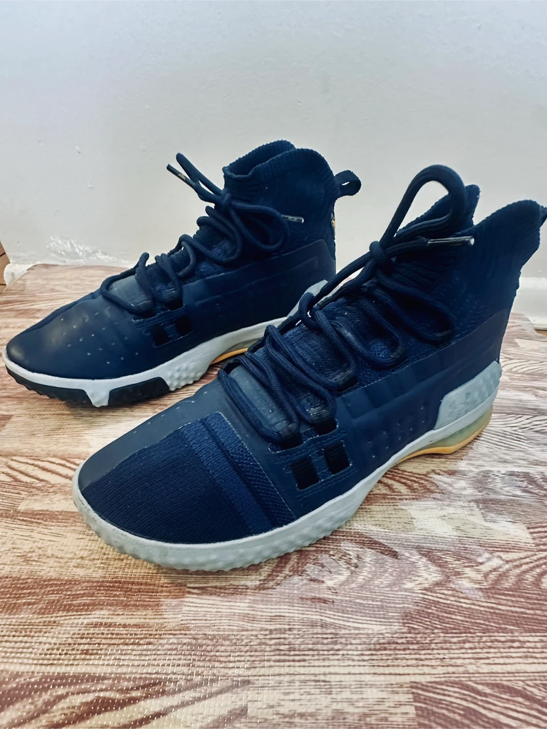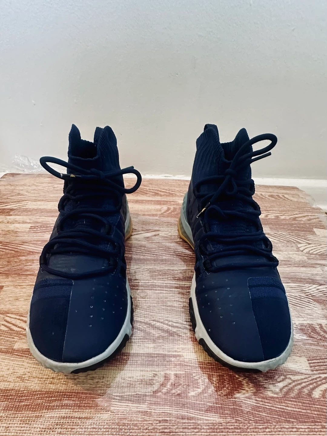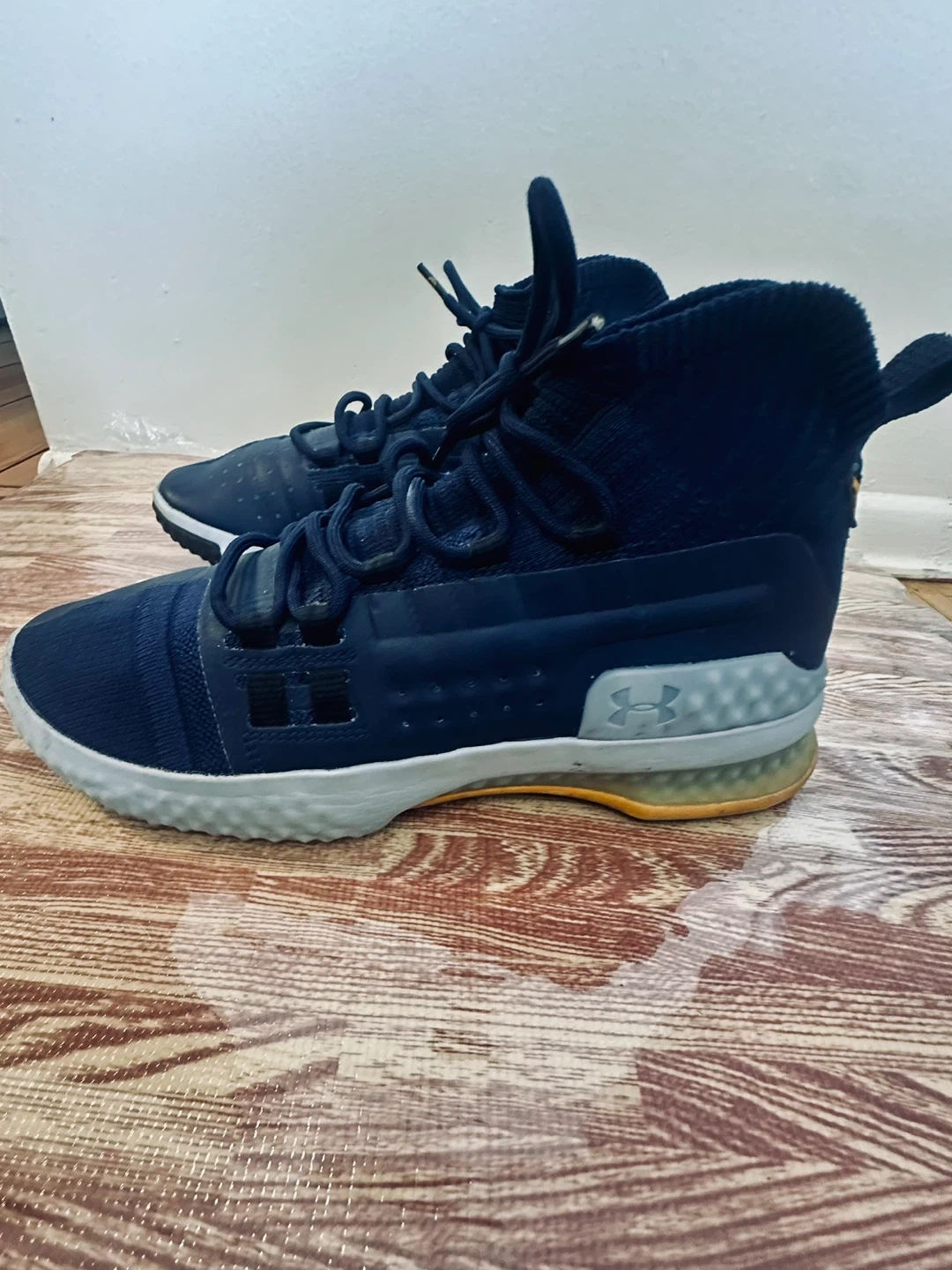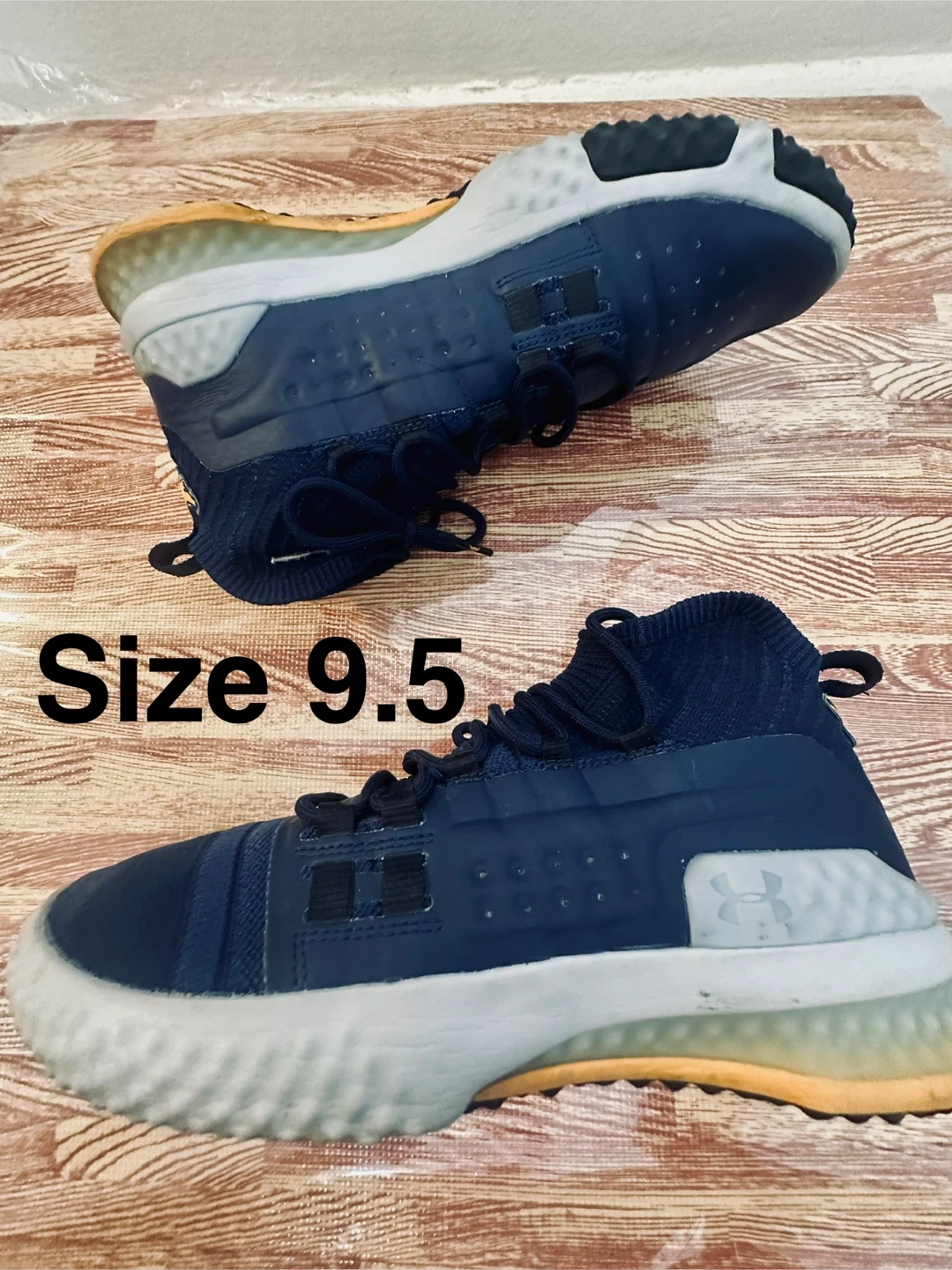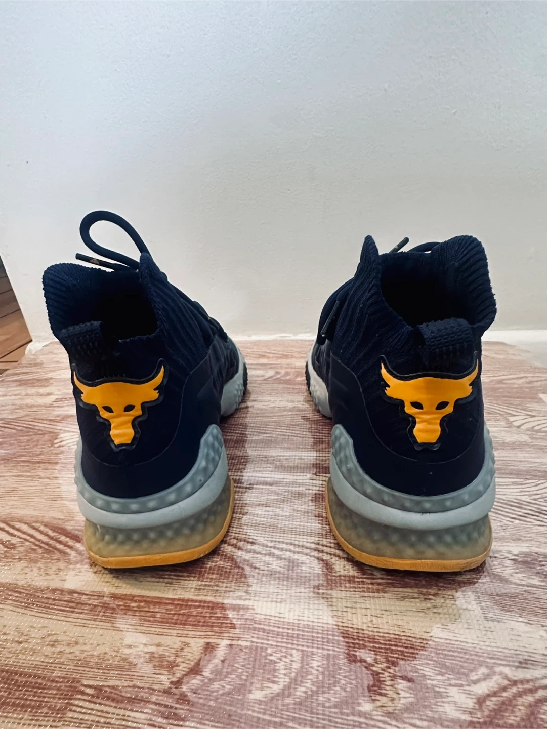 These navy Under Armour Project Rock 4 training shoes are size 9.5. They feature a comfortable knit sock collar and a durable rubber sole. The iconic Project Rock bull logo is on the heel.