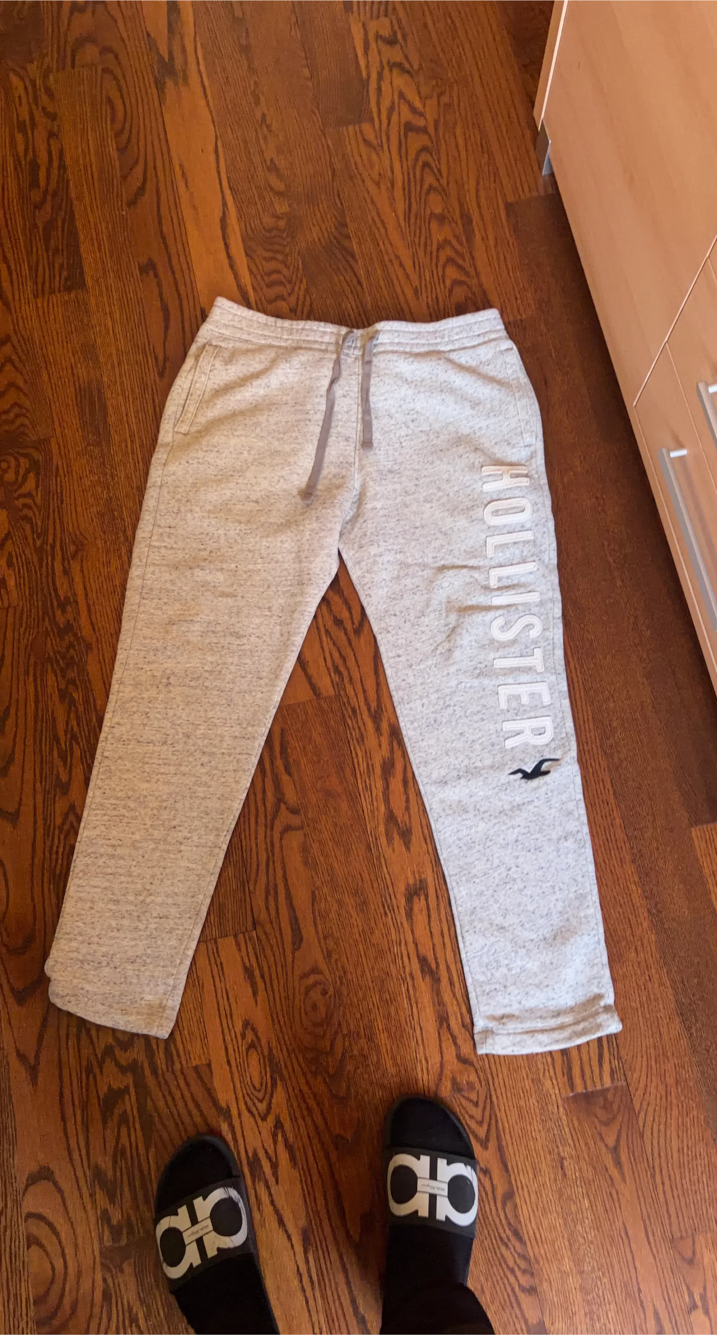 This is a Hollister California hoodie and matching sweatpants set in heather gray. Sweatpants are L, hoodie is size XL. The hoodie has a front pocket and a drawstring hood.