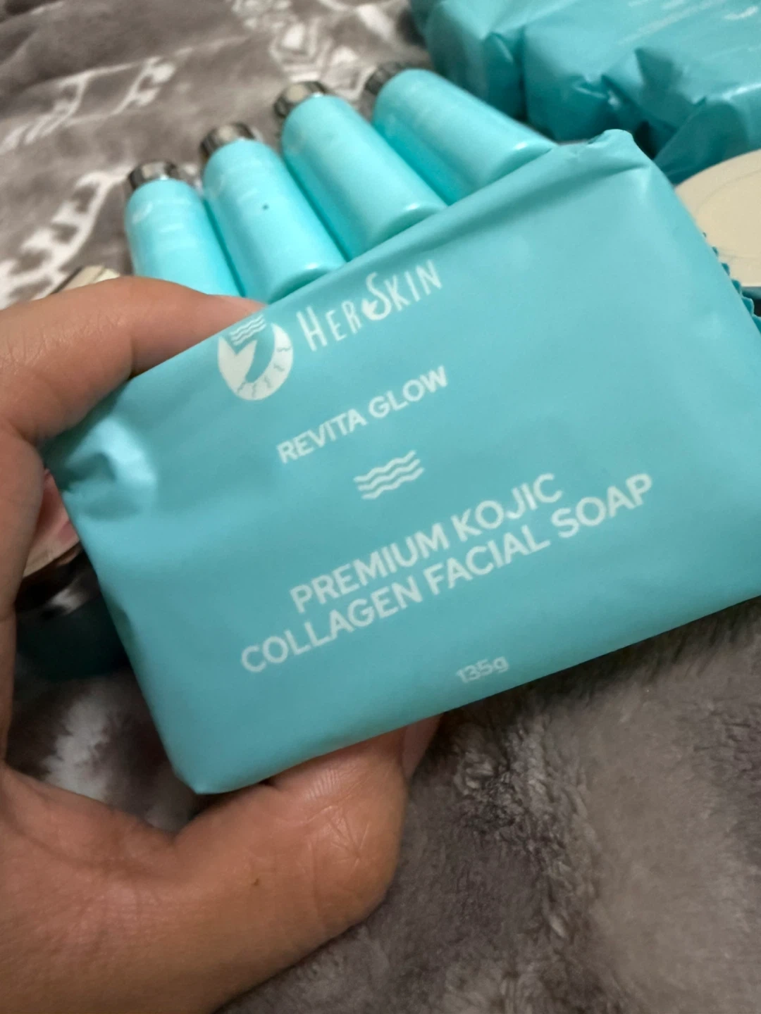 This HerSkin Revita Glow set includes premium kojic collagen facial soap (135g) and revitalizing night gel cream (10g). It also contains revitalizing toner (50 ml). These skincare products are designed to cleanse and rejuvenate the skin.