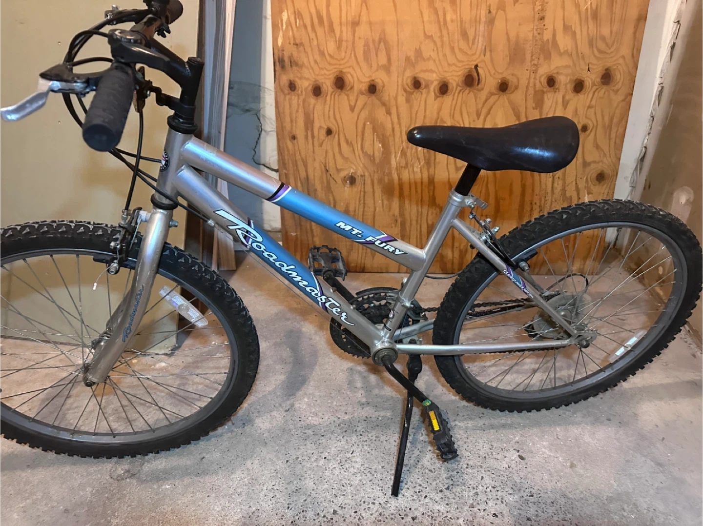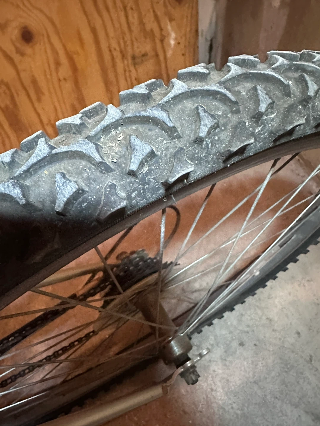 This listing includes bicycle components such as the tire, chain, and gears. The tire features an aggressive tread pattern for off-road use. It's ready for a new bike build or repair project!