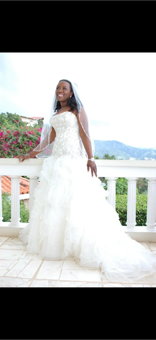 Beautiful strapless wedding gown with a full, ruffled skirt and intricate beading on the bodice. Includes a matching veil. Perfect for your special day!