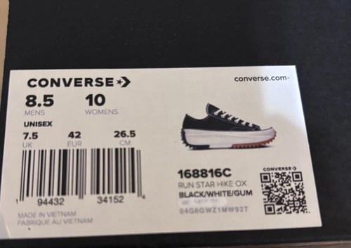 The Converse Run Star Hike Ox in Black White is a stylish sneaker designed for men. This athletic shoe features the signature Converse branding and a style code of 168816C. It is a versatile option for casual wear or athletic activities, showcasing a modern design that is both practical and fashionable. The US shoe size is 8.5, ensuring a comfortable fit for everyday wear.